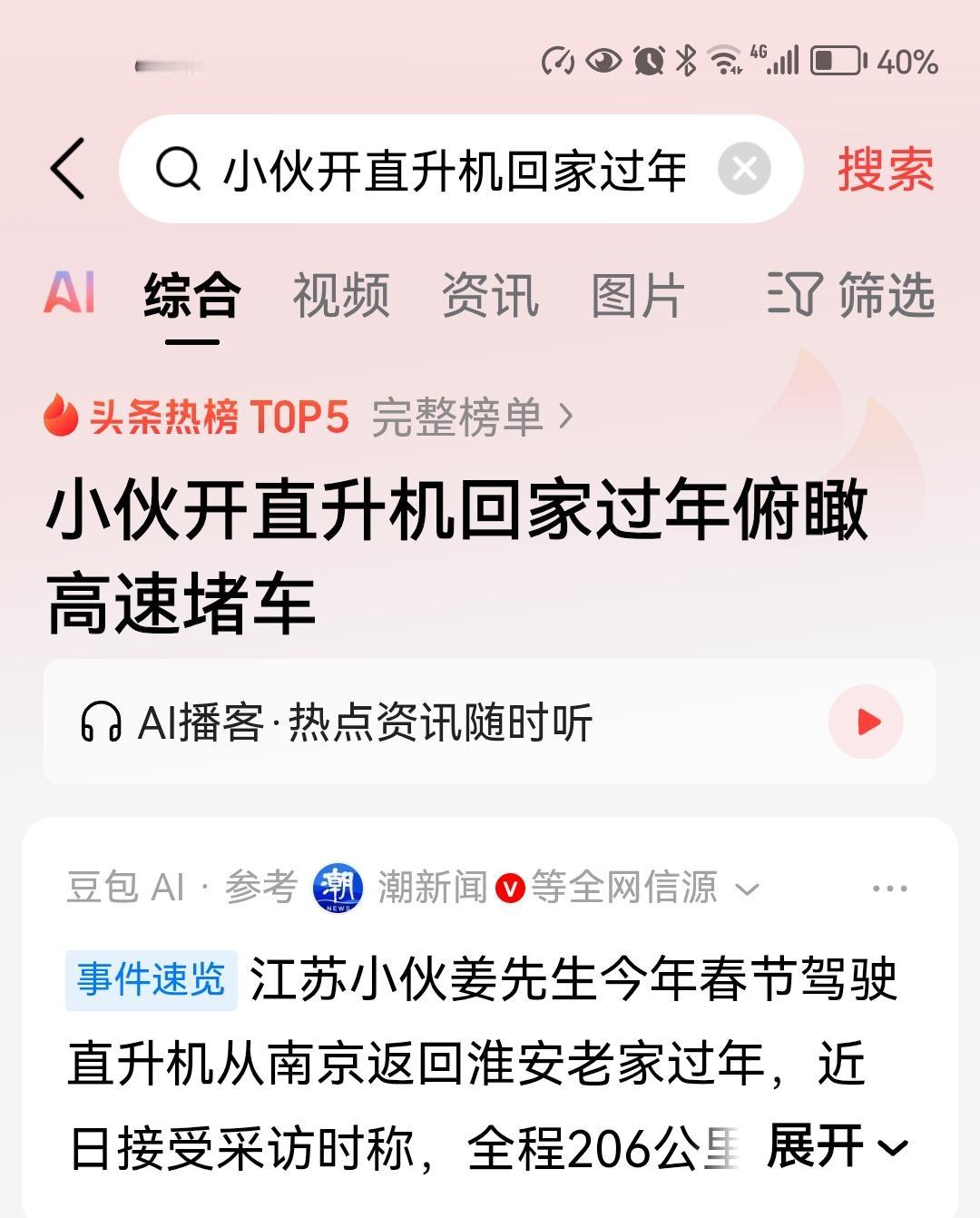 过年回家又有新招式了,开直升机! 首先你得有直升机执照,另外你还得有钱买得起直升机,否则也只能跟其他人一样在高速上被堵。 不知道有多少人能具备这样的条件?原来过年回家都是一票难求,人们坐火车跟逃难似的,现在条件的好的开上汽车回老家了,自然不用忍受坐火车的那种挤,却要忍受高速堵车的苦。 以后让那些有条件开直升机的都开直升机回家,估计高速就没有那么堵了吧!