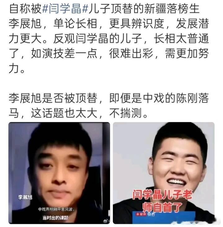 中戏表演系原主任陈刚主动投案,曾培养章子怡,佟丽娅等明星,其中哪些信息值得关注?被闫学晶给干下马了,笑死我了。闫学晶说他儿子夫妻俩年入40万,在北京还贷不容易,引发了众怒。大家顺着线索查,发现闫说他儿子毕业于中央戏剧学院。但是中央戏剧学院的毕业名录上,没有林傲霏这号人,反而在一张照片中,发现林傲霏顶着李展旭这个名字在和同学合影。这就很可疑了。但是林的父亲和学校都跳出来,否认此事。没想到苦主李展旭看到抖音,真的现身了,质疑当年自己分数第一,为什么没有录取通知,原来是真的被冒名顶替。至此,又一起大案被揭开,当初操办此事的陈刚,主动投案自首。中央戏剧学院表演系一年招25个学生,是从几万个艺考生从凌晨四点排队、练到声带充血才拼进来的。闫学晶家三位亲属,三位中戏,概率上这叫奇迹,现实里这叫疑问。2012年那场考试到底是谁顶替谁上了中戏?陈刚出身戏曲世家,本科学演剧,研究生还指导过戏,还特意跑到日本四季剧团待过,爵士舞和踢踏舞都挺拿手的,还曾当过全国艺术科学专家库的专家。 曝闫学晶三位亲属都在中戏闫学晶儿子 李展旭