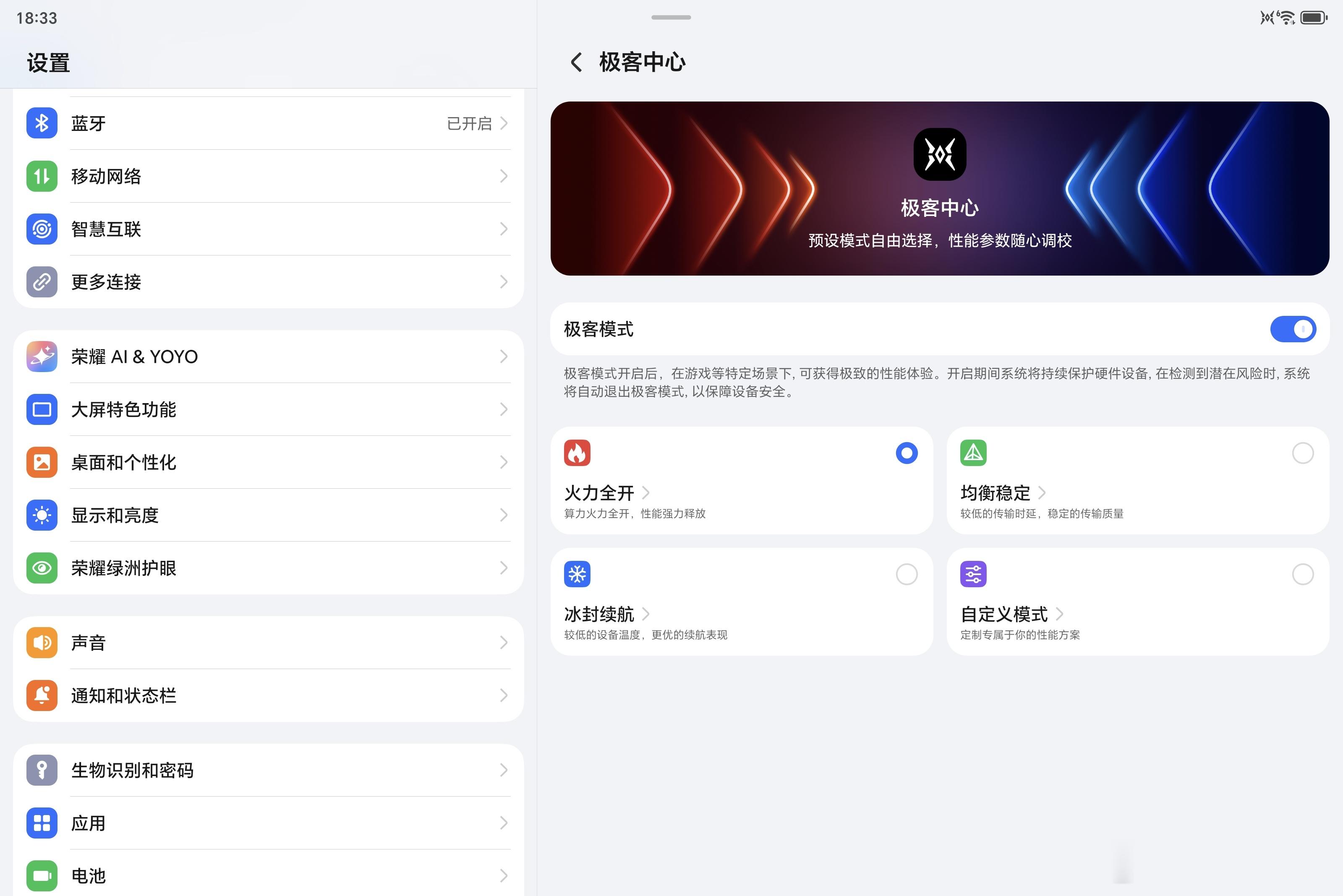 春节前有个好消息告诉荣耀MagicPad3Pro 平板用户,快去升级最新的136版本,咱们可以使用业界首发的极客模式,这个模式里甚至可以自定义调节性能核心选项,比如前置165Hz高刷模式,就算是第三方APP都可以强制用上,榨干屏幕的优秀性能。