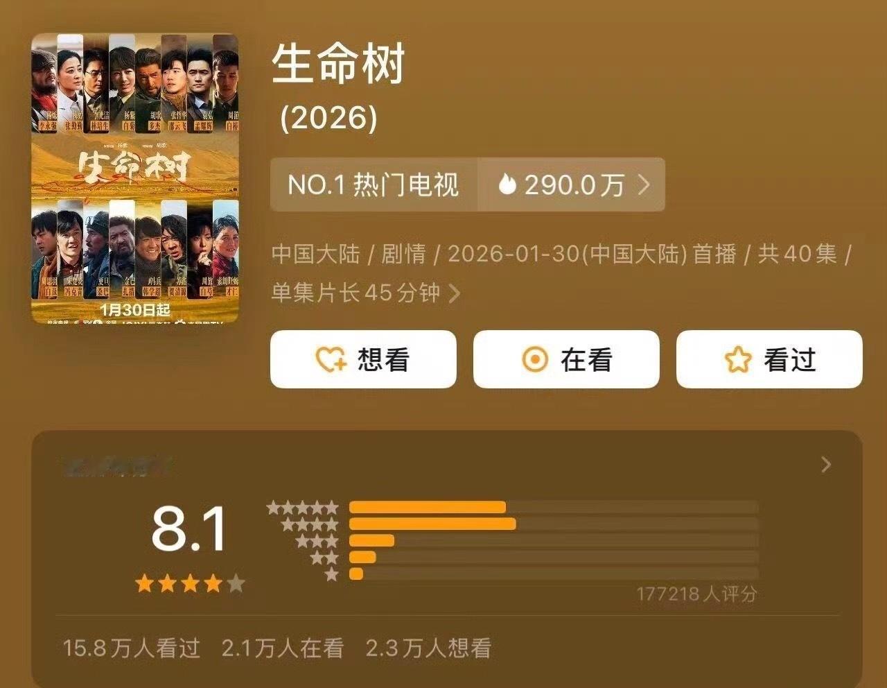 生命树豆瓣开分8.1生命树豆瓣打分人数杨紫、胡歌《生命树》豆瓣开分8.1 ,17w+人打分!这高的真的出乎我的意料了,毕竟流量的剧都有粉圈互打低分的!竟然没拉低!