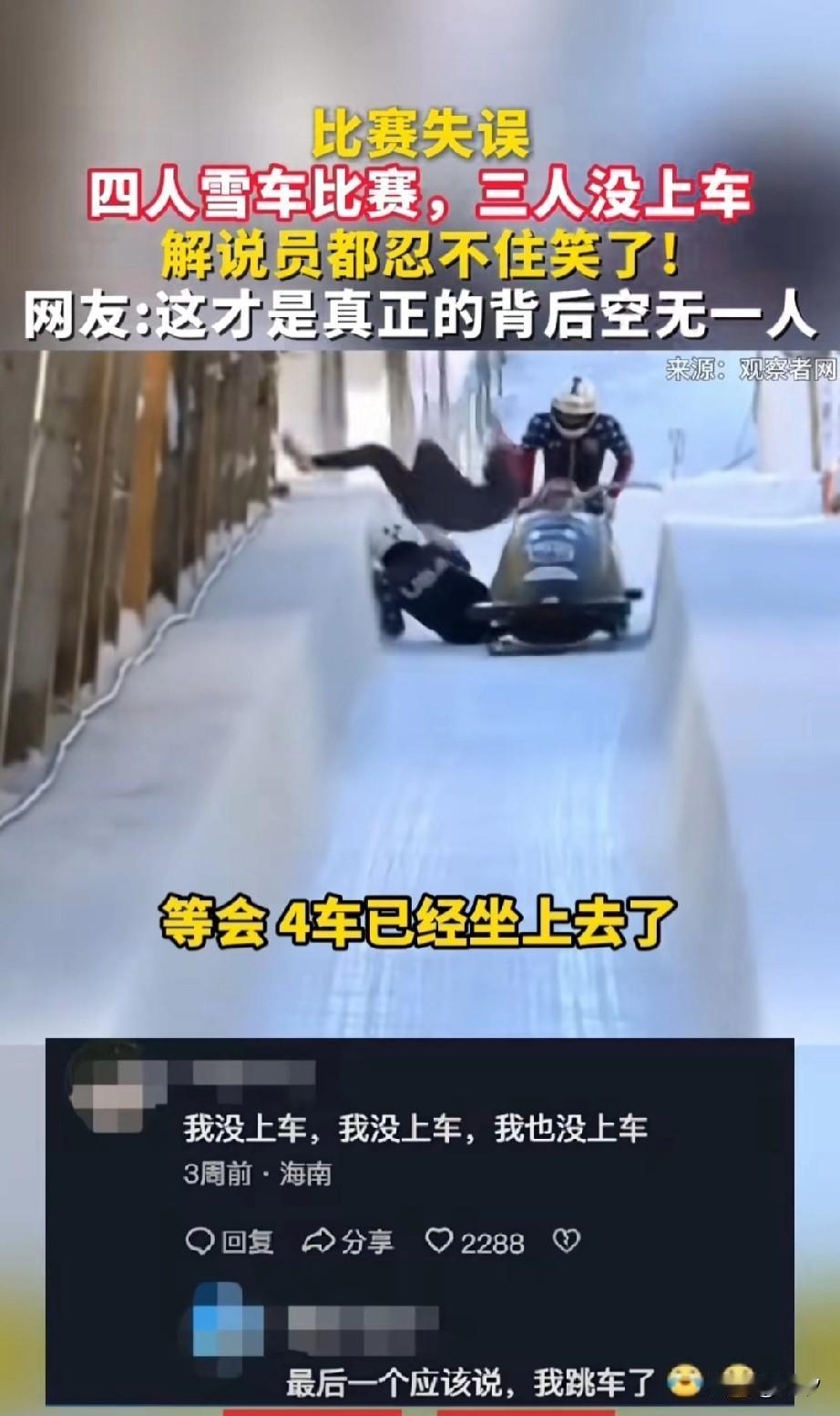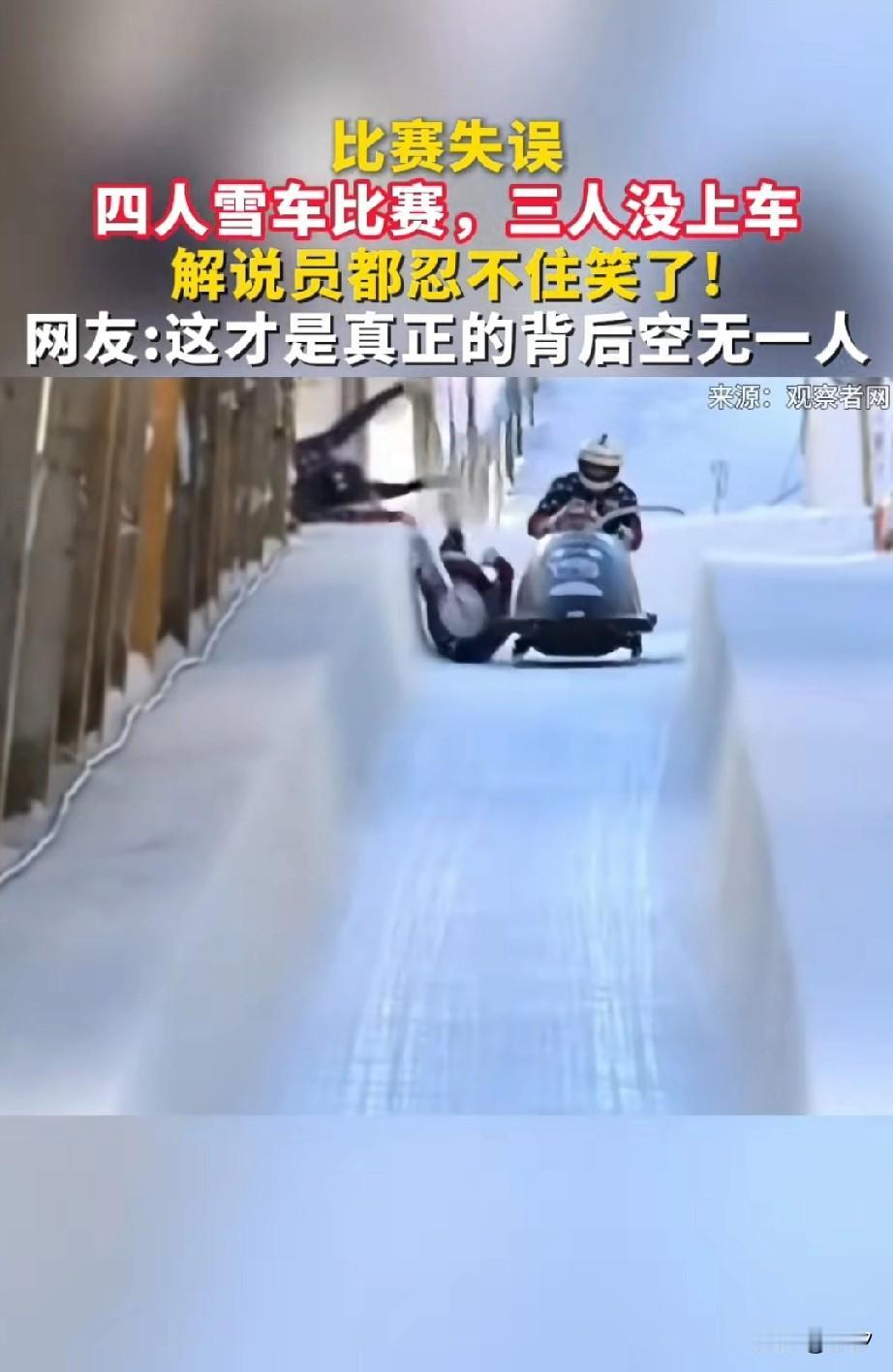 谁能想到四人雪车居然会出现名场面, 比赛刚开始, 几个人推着雪车走上了滑道, 最前面的人坐了下去, 后面几个本身是要挤上去的, 结果车开了,人没上去, 最后上去的一个人干脆跳车, 摔下来的两个人本来是要压弯儿的, 结果硬生生是一个人上了车, 这哥们全程比较惊慌, 连主持人都调侃, 谁踩刹车谁控制方向, 可是比赛已经开始,无法停下, 这位小哥一个人独自完成了四个人干的活,最后也是非常刺激的完成了比赛, 专业人士都为他捏了把汗, 毕竟一个人很难驾驭这种雪车, 当另外三名队友没有坐上车的时候, 比赛名次已经失去了意义, 只要能完成比赛就是一场胜利, 就是失误造成了雪车场上名场面, 当两个人没有赶上雪车的时候, 居然有一个人直接跳车! 可能是怕雪车失控, 最前面的显然没有反应过来, 网友纷纷调侃我没上车,我没上车,我也没上车! 大家觉得这场雪车比赛好玩吗? 冰雪拉力赛 冰雪冰车 冰雪车 全国雪车锦标赛 全国雪车冠军赛