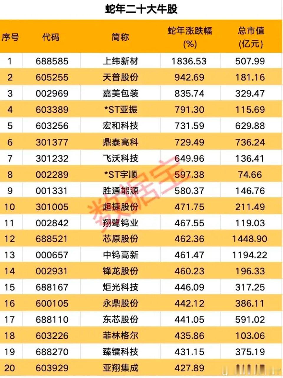 蛇年二十大牛股蛇年A股行情收官,二十大牛股正式出炉!上榜标的集中在电子、有色、机械设备、汽车零部件等高景气赛道,全年涨幅427.89%~1836.53%,市值区间74.66亿~1448.90亿。主线清晰聚焦:科技成长爆发 + 周期资源复苏 + 困境反转逆袭,资金对高弹性、高成长标的偏好极致凸显。 一、蛇年二十大牛股全榜单1. 上纬新材(电子)|涨幅1836.53%,市值507.99亿覆铜板+电子材料,受益电子行业全面复苏,需求爆发登顶蛇年涨幅榜首。2. 天普股份(汽车零部件)|涨幅942.69%,市值181.16亿汽车密封+管路系统,新能源车渗透率持续提升,配套需求高速增长。3. 嘉美包装(包装印刷)|涨幅835.74%,市值329.47亿食品饮料包装,消费复苏+包装升级+渠道扩张共振大涨。4. ST亚振(家居)|涨幅 791.30%*,市值115.69亿实木家具,资产重组+业务调整实现困境反转,叠加地产链复苏。5. 宏和科技(建材)|涨幅731.59%,市值629.88亿电子级玻纤布,电子+建材双重逻辑,产品需求持续旺盛。6. 鼎泰高科(机械设备)|涨幅729.49%,市值736.24亿精密刀具+智能制造,高端制造+工业母机政策双驱动。7. 飞沃科技(机械设备)|涨幅649.96%,市值136.41亿风电紧固件,风电装机放量,行业高景气直接受益。8. ST宇顺(电子)|涨幅 597.38%*,市值74.66亿触控显示+电子制造,业务转型+资产整合,困境反转弹性极大。9. 胜通能源(交通运输)|涨幅580.37%,市值146.76亿LNG运输销售,能源结构转型+需求增长+运力扩张。10. 超捷股份(汽车零部件)|涨幅471.75%,市值211.49亿汽车紧固件+精密冲压,新能源车产业链核心配套。11. 翔鹭钨业(有色)|涨幅467.55%,市值119.03亿钨制品,钨价上行+供需格局改善+产能释放。12. 芯原股份(电子)|涨幅462.36%,市值1448.90亿半导体IP龙头,AI+半导体高景气,技术壁垒深厚。13. 中钨高新(有色)|涨幅461.47%,市值1194.22亿钨+硬质合金,产业链整合+需求回升,龙头价值重估。14. 锋龙股份(汽车零部件)|涨幅460.23%,市值196.33亿液压零部件+电机,受益新能源车+智能驾驶升级。15. 炬光科技(电子)|涨幅446.09%,市值317.25亿激光雷达+光学器件,自动驾驶落地带动订单爆发。16. 永鼎股份(通信)|涨幅442.12%,市值386.11亿光通信+电力电缆,5G+算力网络建设持续催化。17. 东芯股份(电子)|涨幅441.05%,市值591.02亿存储芯片,价格回升+国产替代,产能释放业绩高增。18. 菲林格尔(家居)|涨幅435.86%,市值103.06亿地板+家居,消费复苏+渠道拓展+品牌升级。19. 臻镭科技(电子)|涨幅431.15%,市值375.19亿射频芯片+传感器,物联网+通信技术突破。20. 亚翔集成(建筑装饰)|涨幅427.89%,市值313.17亿洁净室工程+半导体配套,芯片产能扩张,订单持续饱满。 二、总结蛇年二十大牛股呈现三大核心特征:1. 电子、有色、机械设备占据绝对主力,科技成长+周期复苏为最强主线;2. 行业高景气、技术迭代、国产替代、政策驱动是股价爆发核心动力;3. ST困境反转股表现亮眼,高弹性、低基数标的备受资金追捧。整体反映出蛇年市场:重成长、重弹性、重反转、重赛道景气度的核心风格。注:以上内容基于公开数据整理,不构成投资建议。