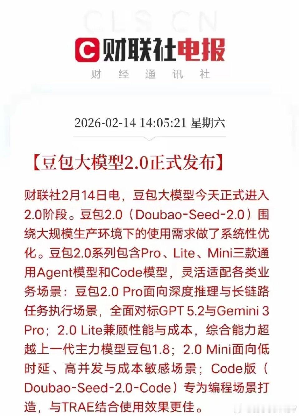 豆包大模型2.0(Doubao-Seed-2.0)正式发布!全产业链受益2026年2月14日,字节跳动豆包大模型2.0重磅上线!本次升级围绕大规模商用落地进行全栈优化,推出Pro/Lite/Mini三款通用Agent模型+Code模型,性能全面对标GPT 5.2、Gemini 3 Pro,覆盖深度推理、成本敏感、AI编程等全场景。此次发布将直接拉动算力基建、端侧AI硬件、多模态内容、字节生态合作四大产业链需求,相关上市公司迎来业绩与估值双击机遇。一、核心受益概念股全梳理(按赛道分类)【算力底座·直接受益】1. 浪潮信息:字节AI服务器核心供应商,为豆包2.0训练与推理提供算力支撑,液冷服务器适配高密度AI计算,2025年订单超30亿元,业绩确定性高。2. 润泽科技:字节核心IDC与算力合作伙伴,直接受益推理算力需求爆发,高密度算力中心覆盖京津冀、长三角,机柜上架率与营收同步提升。3. 中科曙光:为字节提供智算服务与服务器,深度参与大模型训练集群,液冷与高密度算力方案保障模型高效运行,算力订单持续增长。【AI营销与内容变现】1. 利欧股份:接入Seedance 2.0 API,AI视频创意降本增效超40%,构建“核心代理+技术协同+生态联动”三层合作,是字节AI营销生态核心伙伴。2. 引力传媒:字节双牌照代理商,聚焦豆包短视频、AI多模态、短剧营销,自研AIGC平台接入大模型,春晚合作带来增量。3. 掌阅科技:字节持股约7%,泡漫平台为国内首个接入Seedance 2.0的AI漫剧平台,IP视频化变现领先,“调用费+会员费”双模式落地。4. 中文在线:海量小说版权库,字节红果短剧核心合作方,“小说转短剧”成本降70%、周期缩至3天,AI短剧出海弹性充足。5. 万兴科技:万兴喵影深度集成Seedance 2.0插件,AI视频生成覆盖短视频、电商营销,付费转化率持续提升。6. 蓝色光标:AI营销龙头,用Seedance制作广告短视频降本超30%,依托字节生态服务快消、汽车等品牌客户,订单量稳步增长。7. 捷成股份:影视版权龙头,与字节合作AI短剧与内容二次创作,版权库变现渠道拓宽,分销收入增长。【端侧AI·跨设备落地】1. 中科创达:独家适配豆包端侧系统,覆盖手机、车机,技术壁垒突出,助力跨设备智能交互,场景快速拓展。2. 乐鑫科技:AI玩具芯片供应商,大模型植入智能硬件,支撑端侧语音与AI推理,智能家居、智能玩具出货量提升。3. 恒玄科技:AI耳机主控芯片厂商,BES2600YP实现端侧大模型实时交互,深度绑定头部品牌,AI耳机渗透率提升。4. 昀冢科技:独家供应豆包AI手机摄像头组件,市占率超90%,AI影像与多模态交互需求带动订单增长。【生态配套与内容场景】1. 兆驰股份:风行在线与火山引擎深度合作,共建AI创作平台,深度绑定字节生态,为Seedance 2.0提供技术支撑。2. 荣信文化:借力豆包开发AI绘本、有声读物,创作效率提升,少儿数字阅读份额扩大。3. 上海电影:影视IP+线下场景,用Seedance制作宣发短视频,打通“影视+AI短视频”闭环,降本增效。4. 欢瑞世纪:联合抖音、即梦AI出品生成式短剧,依托IP库缩短制作周期、降低成本,短剧业务占比提升。二、总结豆包大模型2.0发布,标志国产大模型正式进入高性能、全场景、规模化商用新阶段,产业链受益逻辑清晰:算力基础设施直接承接训练与推理需求,业绩确定性最强;端侧AI硬件受益跨设备交互普及,打开成长空间;多模态应用与字节生态合作方通过技术集成快速变现,弹性最大。算力底座+内容应用为两大核心主线,相关企业业绩兑现与估值提升值得持续跟踪。