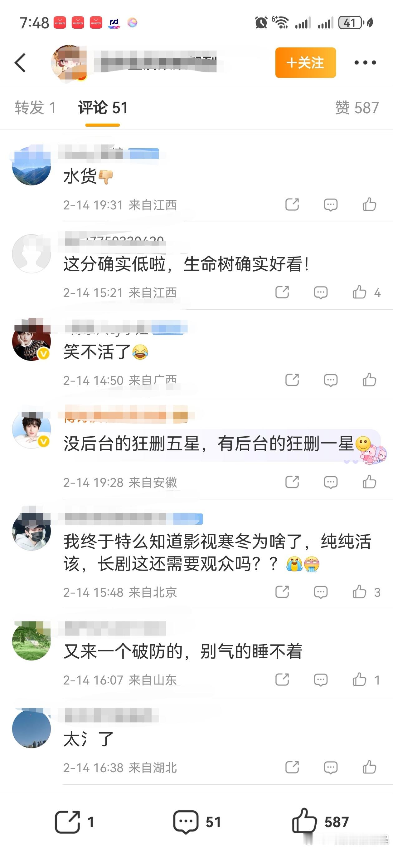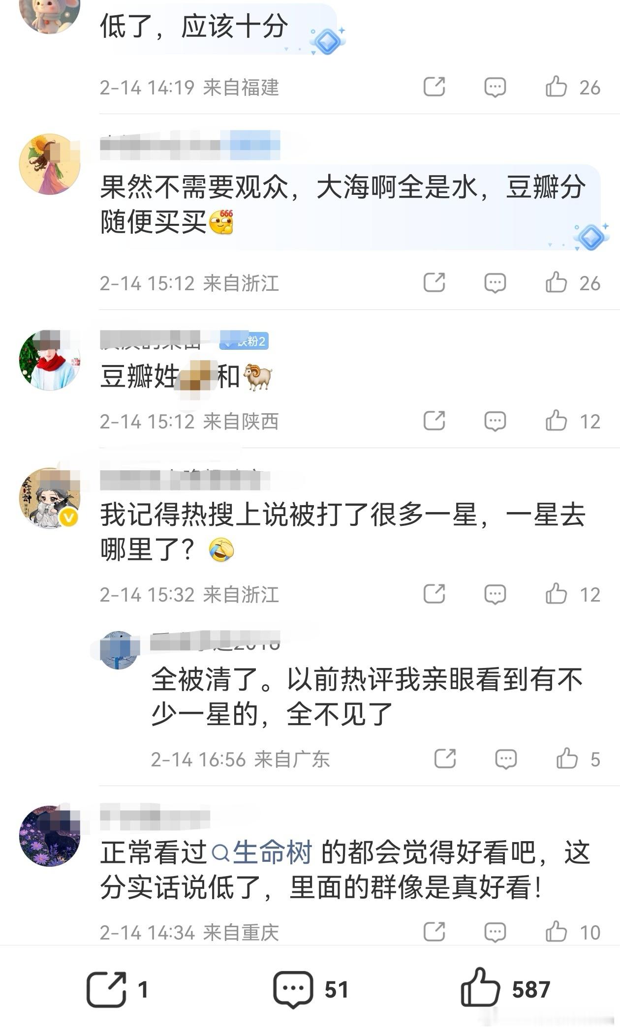 老の家yxh对生命树豆瓣开分可酸了,评论区一溜烟的酸,也不想想自己家买分买的豆瓣发公告,打分区异常。