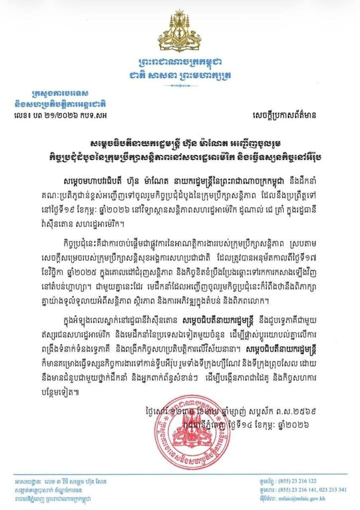 柬埔寨首相洪玛奈将率团前往华盛顿,出席定于2月19日举行的和平理事会首次会议。