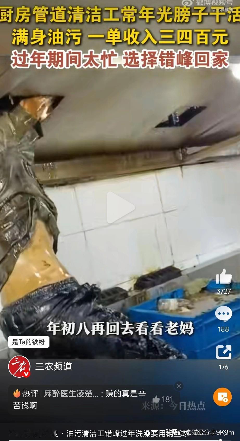 油污清洁工洗澡要用钢丝球 今天腊月二十七,家家户户都在抢票回家,可河南周口的管道清洁工老张,却穿着油污马甲蹲在饭店后厨——他正用铁铲、洗洁精和洗衣粉,跟管道里的“黑油山”死磕! “这管子一年没清,油垢结得比石头还硬,不爬进去铲两小时,根本通不了!”老张抹了把汗,后背的油污在灯光下反光。 他说干完这一单能挣三四百,但最头疼的是收工后的“洗礼”——身上粘的油污,用普通肥皂根本洗不掉,得靠钢丝球硬搓! “皮肤都搓红了,但没办法,回家坐火车不能熏着人…” 更心酸的是,为了不影响饭店营业,他和工友们已经六七年没在除夕夜陪家人了。总是等到年初六初七,才拖着满是油污味的行李箱,匆匆赶回老家看老婆孩子。 “老妈总说‘回来就行,不挑日子’,可每次视频看她盯着团圆饭发呆,心里真不是滋味…” 这些“城市清道夫”用满身油污换来我们的干净年,而他们自己,却只能用钢丝球和错峰车票,换一张回家的团圆照。 他们不是“脏兮兮的工人”,而是用辛苦扛起城市温度的英雄! (文章素材来自三农频道,侵删)