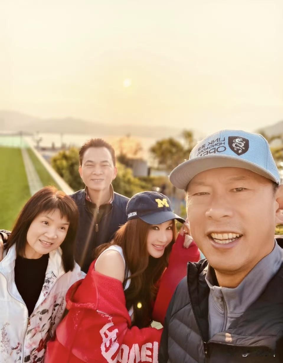 一般定律来讲,温碧霞的肩膀非露不可。她老公和友人都是穿得严严实实规规矩矩,而她必须要露个肩膀,合照中第一眼必须看到她。