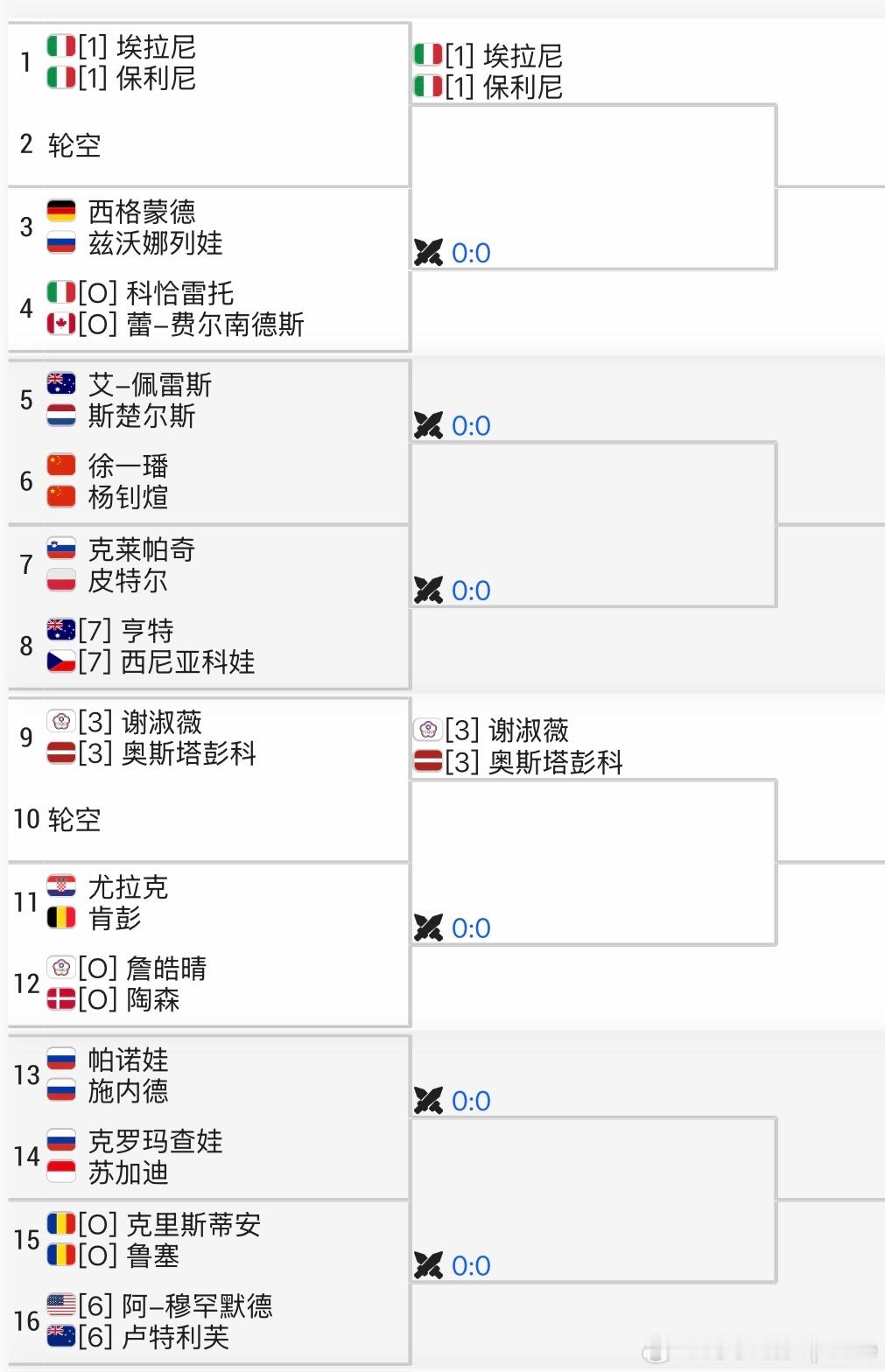 WTA1000🇦🇪迪拜站女双签表🇨🇳张帅/🇧🇪梅尔滕斯 轮空🇨🇳徐一璠/🇨🇳杨钊煊vs🇳🇱斯楚尔斯/🇦🇺佩雷兹🇨🇳蒋欣玗/🇳🇴爱克里vs🇨🇿布兹科娃/🇮🇩曾丽美