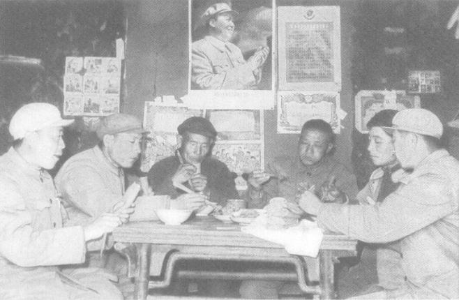 1965年9月,王建安(右三)在山东淄博周村区孟家埝,参加社会主义教育运动时与工作队成员在老乡家共餐。