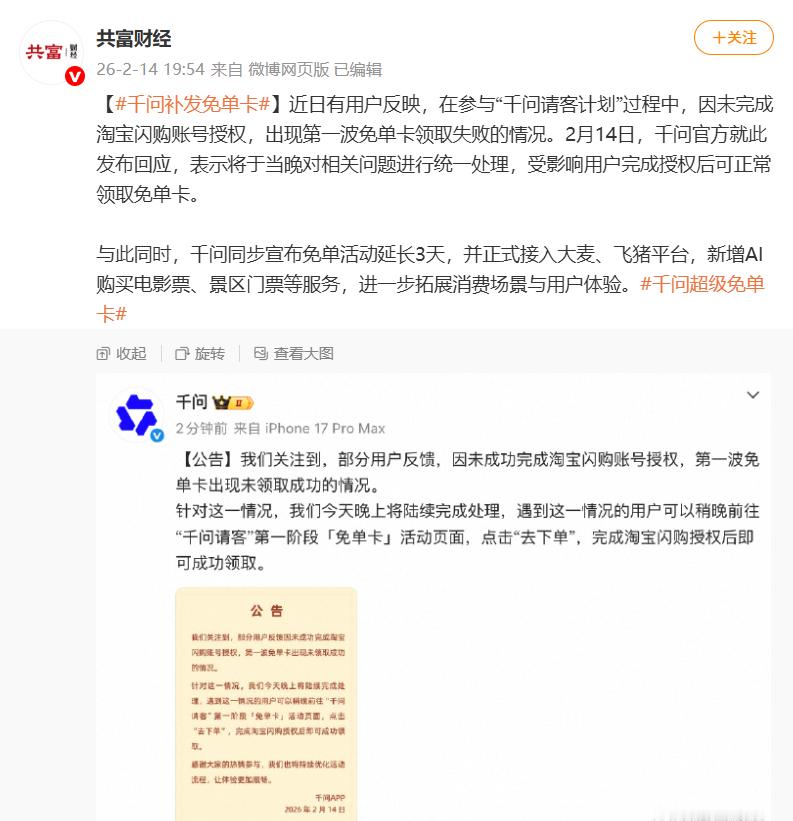 这两天千问免单卡,有人反应因为没授权淘宝闪购导致第一波免单卡领取失败。好在千问反应迅速,2月14号晚上将统一处理,完事儿还能正常领,顺便把活动延长了三天,真的诚意满满。