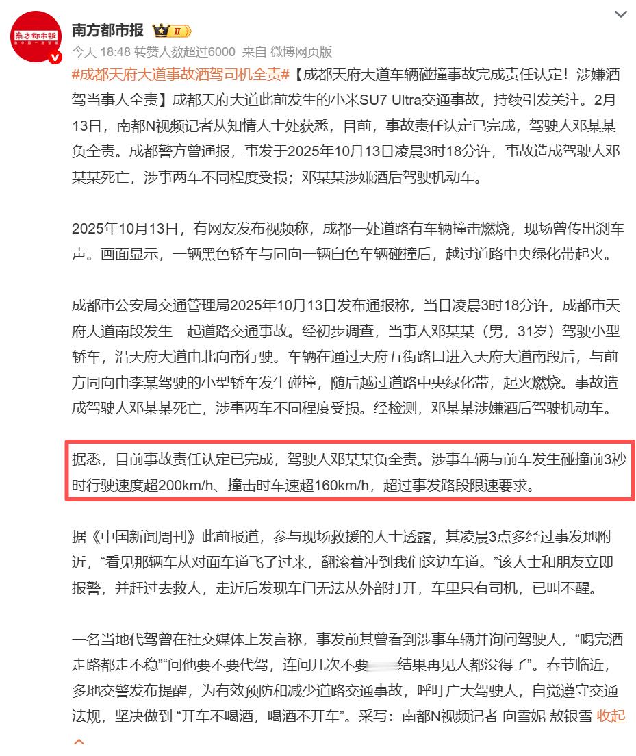 小米SU7 ultra成都天府大道的事故完成责任认定!涉嫌酒驾当事人全责。报道中提到车速超过200km/h,这种署名报道可不会瞎写。