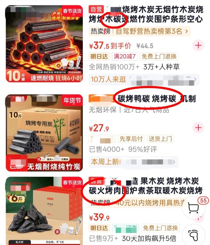 随后,记者搜索“木碳”“烧碳”等关键词,跳出的链接中,多个店铺商品介绍里赫然写着“烧烤碳”“机制碳”,接连出错。