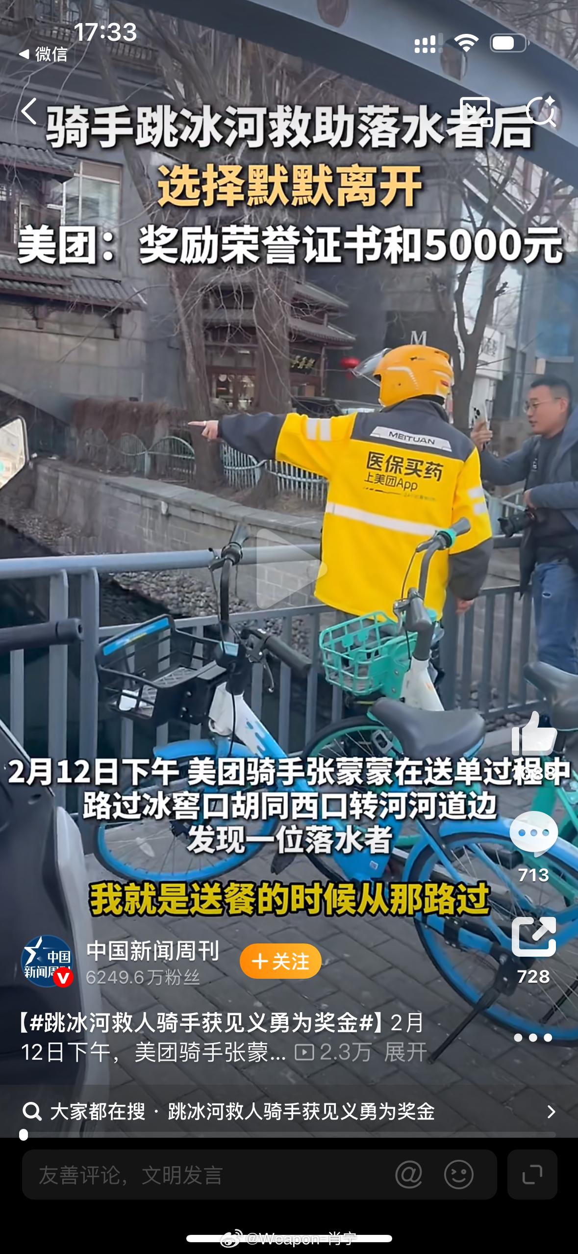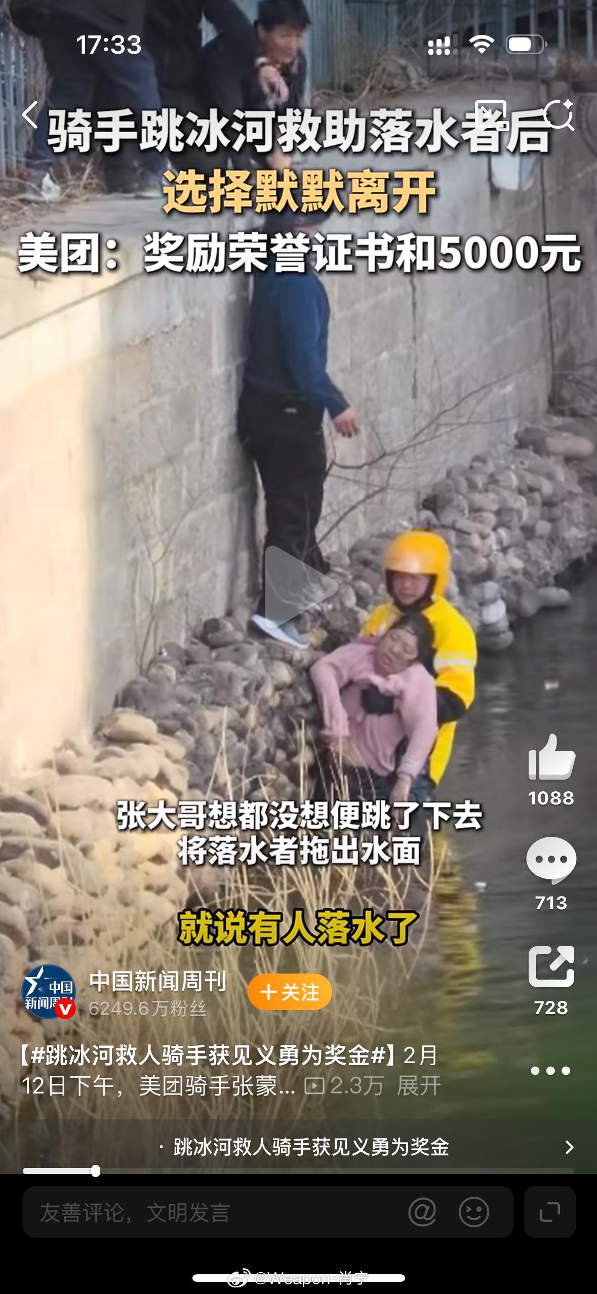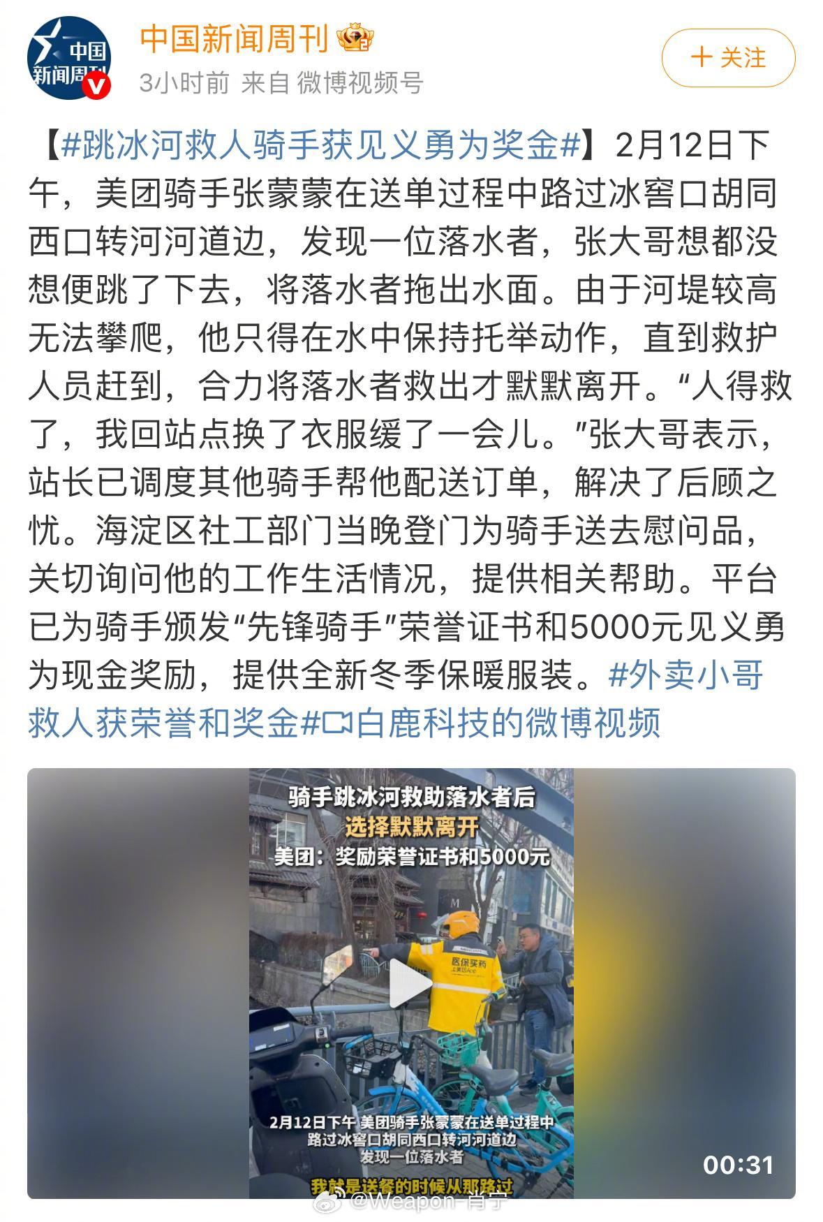 跳冰河救人骑手获见义勇为奖金外卖小哥救人获荣誉和奖金 这两天看到一个新闻,杭州那个跳进冰河救人的外卖骑手,获得了见义勇为奖金。这事看起来确实有些东西可以聊聊。