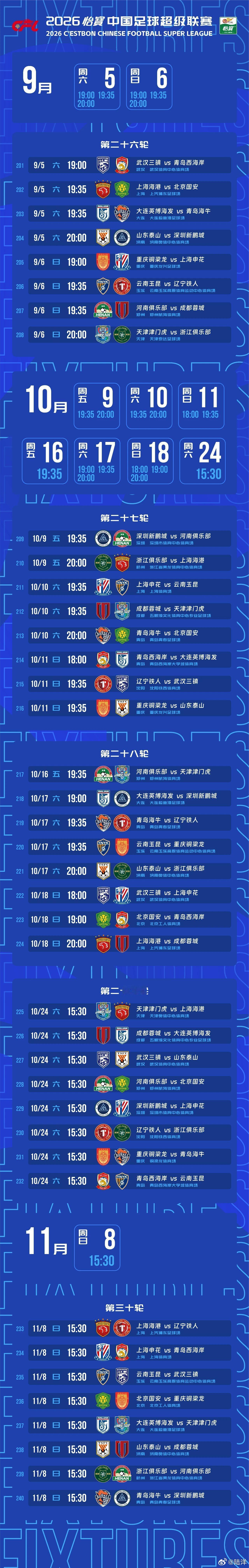 2026中超赛程 总算公布了,5月亚少赛和6月下旬7月世界杯期间都照踢不误,今年可能会错过不少现场观战的机会,争取第一循环先确保把3.21重庆vs成都和4.22辽宁vs大连两场看了吧