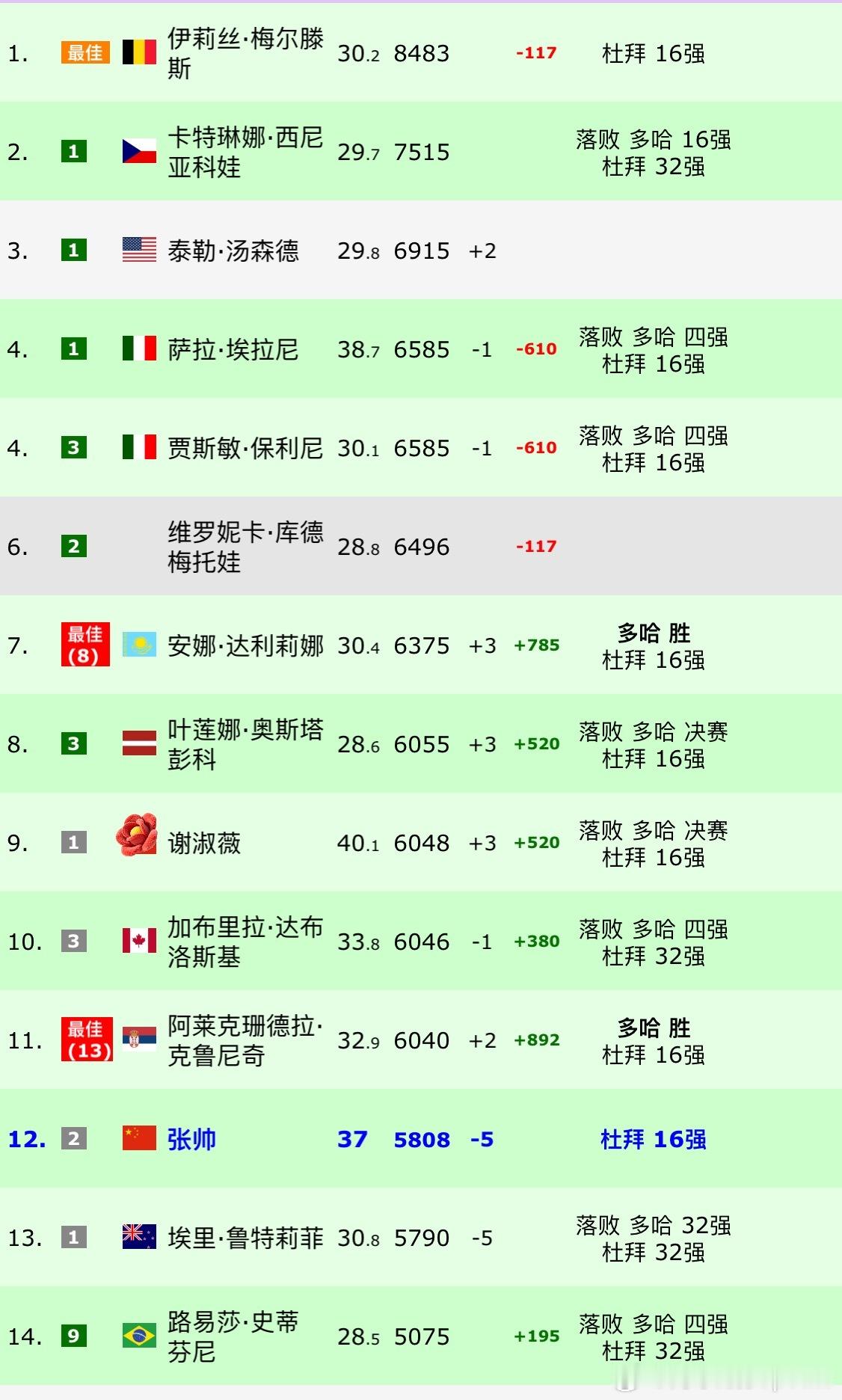 这样决赛的四位球员 达尼丽娜、克鲁尼奇、谢淑薇、奥斯塔彭科 以及打进四强的 达布洛斯基 排名都超过张帅… 张帅下跌至12 位