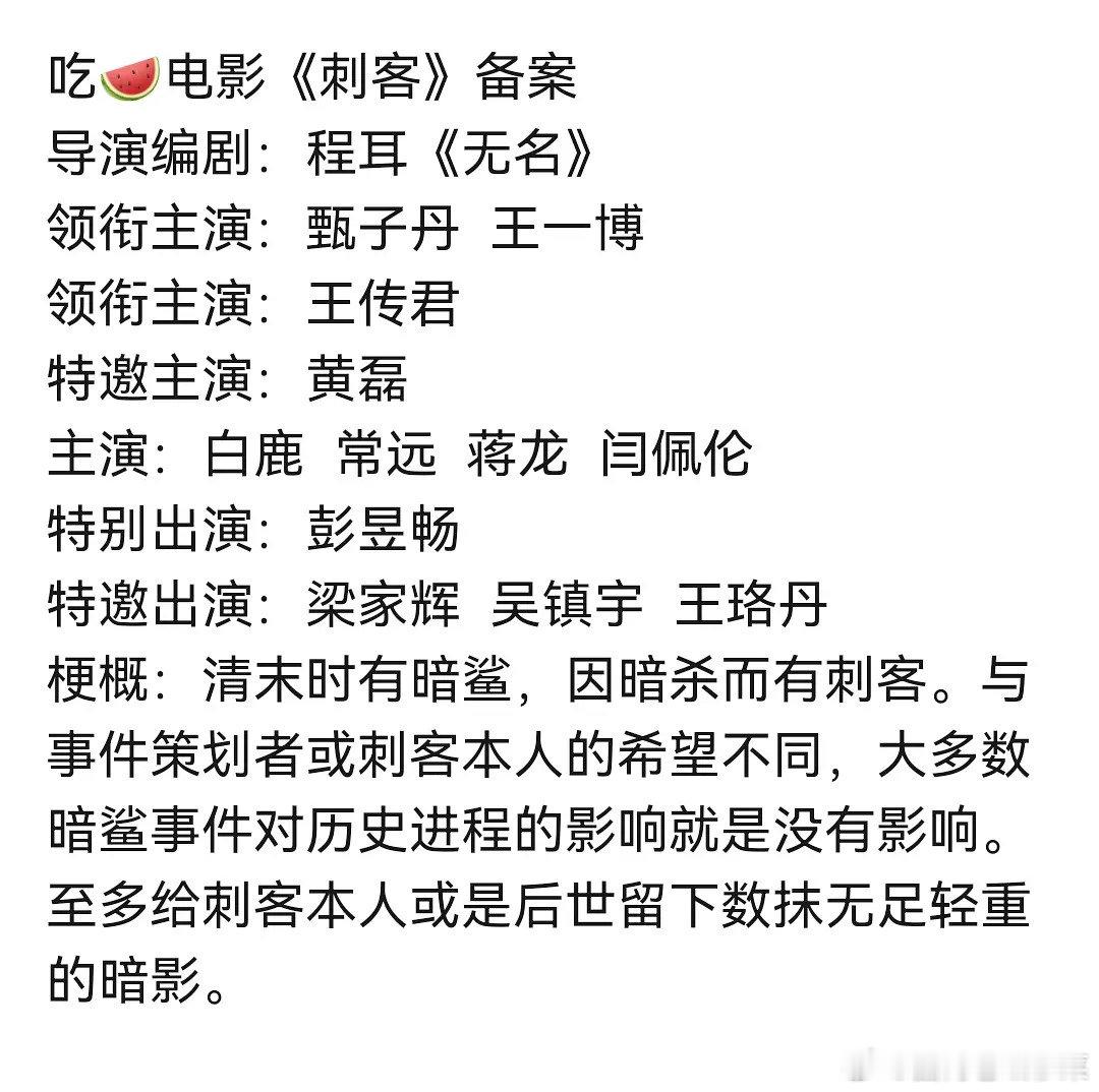 程耳新片《刺客》备案,王一博《人鱼》什么时候上?编剧:程耳梗概:清末时有暗杀,因