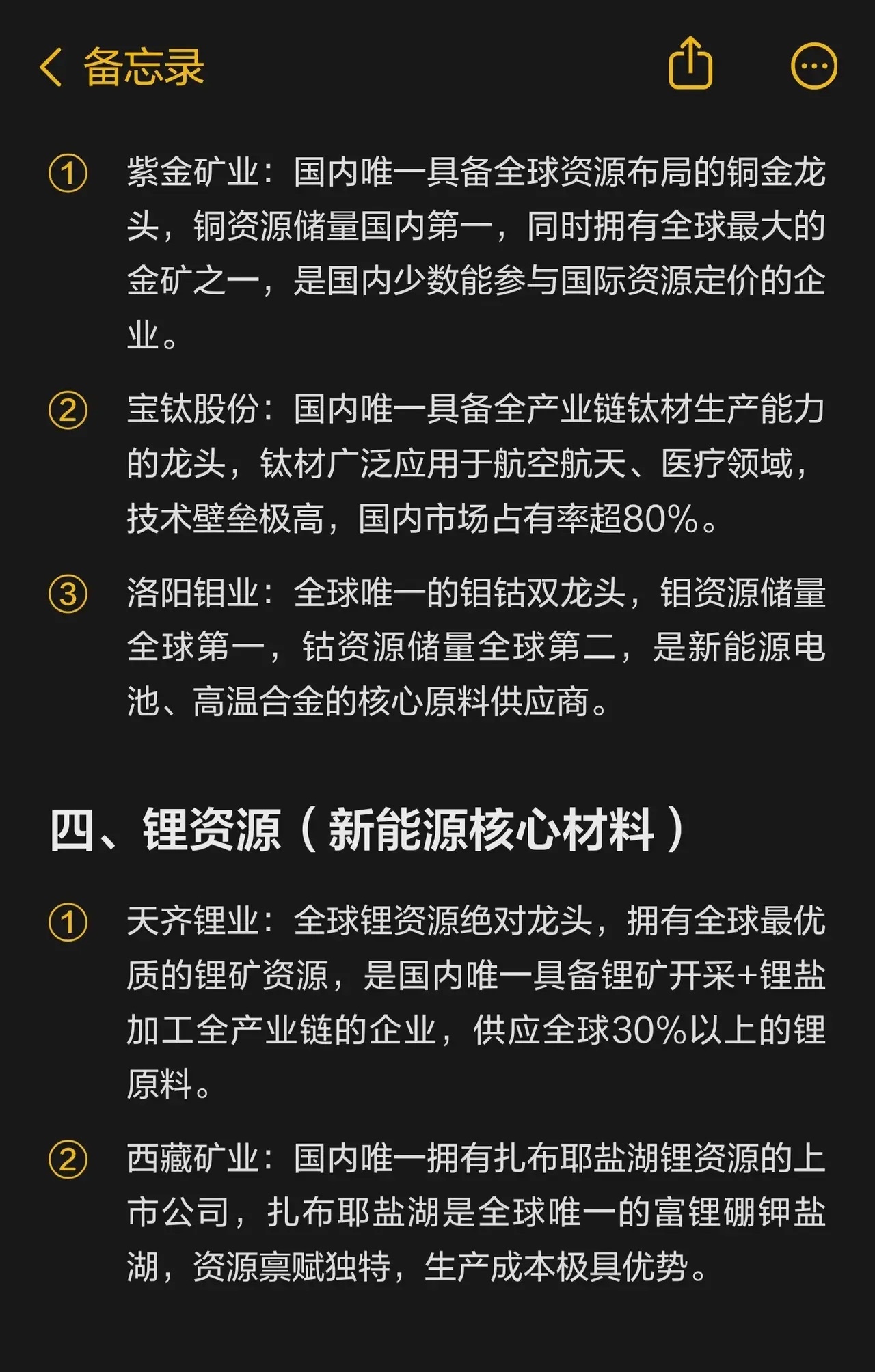 1. 紫金矿业:国内唯一具备全球资源布局的铜金龙头,铜资源储量国内第一,拥有全球最大金矿之一,参与国际资源定价。2. 宝钛股份:国内唯一具备全产业链钛材生产能力的龙头,钛材应用于航空航天、医疗,技术壁垒高,国内市场占有率超80%。3. 洛阳钼业:全球唯一钼钴双龙头,钼资源储量全球第一、钴全球第二,是新能源电池、高温合金核心原料供应商。