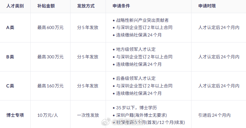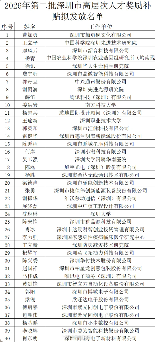 2026年第二批深圳高层次人才奖励补贴名单,分ABC类,最低C类160万,中间B类300万,最高A类600万。