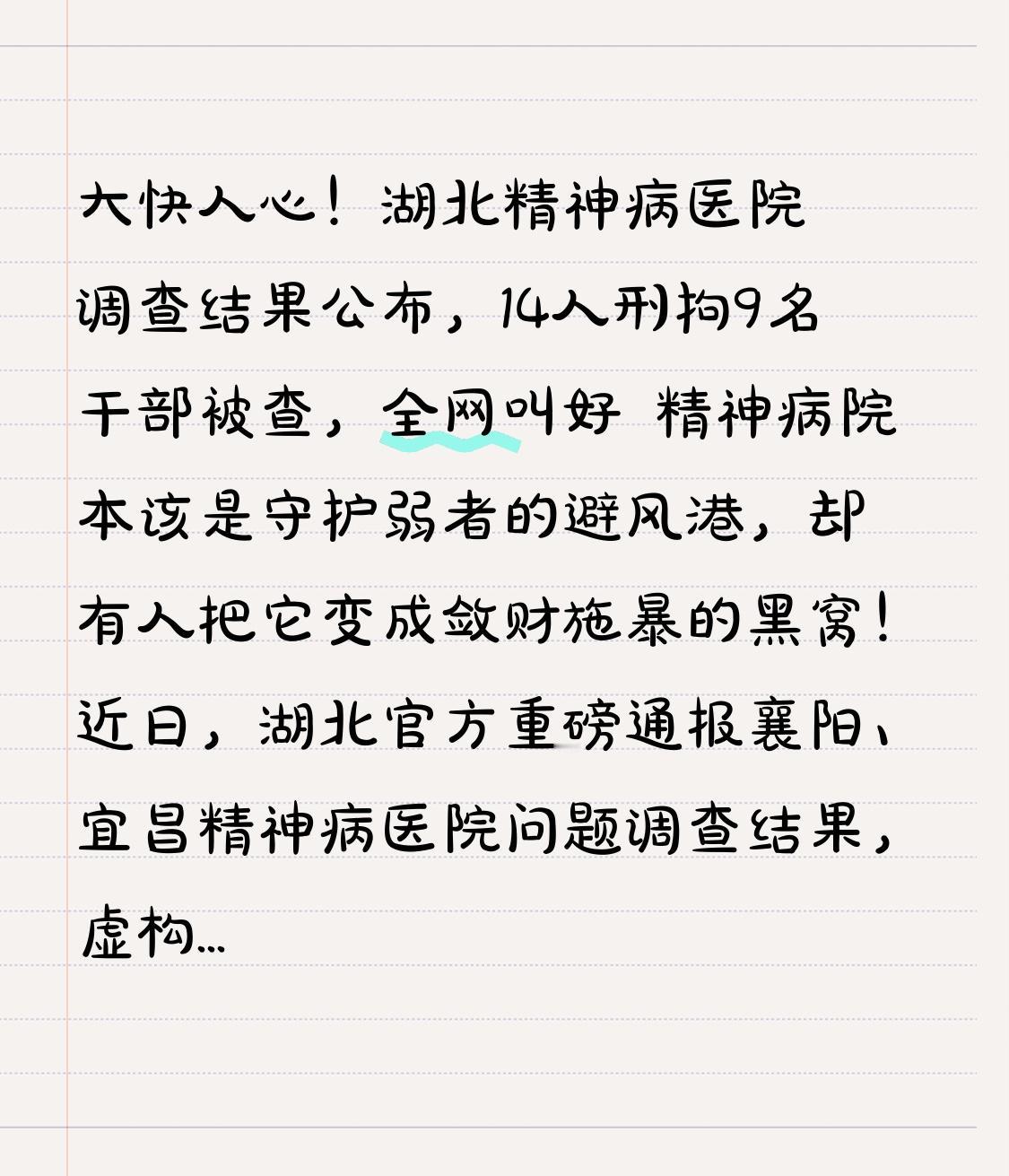 大快人心!湖北精神病医院调查结果公布,14人刑拘9名干部被查,全网叫好 精神病院本该是守护弱者的避风港,却有人把它变成敛财施暴的黑窝!近日,湖北官方重磅通报襄阳、宜昌精神病医院问题调查结果,虚构项目骗保、护工殴打患者、监管失职渎职,一桩桩恶行被彻底扒开,处理力度史无前例,看完极度舒适! 消息刚曝光时,全网震怒:本该被细心照料的精神障碍患者,竟在医院里遭殴打、被过度收治;老百姓的医保“救命钱”,被人明目张胆套取。大家最担心的是:涉事方遮遮掩掩、大事化小,弱势群体的公道无处可寻。 就在无数人揪心等待时,重磅转折点来了!官方调查结论与处置结果,直接亮明零容忍态度! 经查,两地10家机构涉嫌骗取医保基金348.59万元,靠虚构服务、伪造报告、虚开费用疯狂敛财;3家医院存在护工、护士殴打患者恶行,4名施暴人员被行政处罚;6家医院违规诱导收治患者,甚至让痊愈者长期住院套取费用。调查同时澄清:未发现违规收治非精神障碍患者,打消公众最大疑虑。 处置更是雷霆出手:14名医院法人、院长、实际控制人以诈骗罪被刑拘,1名会计因隐匿凭证被抓;9名省市县三级公职人员因受贿、滥用职权被立案调查,省卫健委、医保局负责人及襄阳市长等被严肃追责,两地政府被责令书面检查,涉案医院全被严惩。 从医院作恶到监管失守,一查到底、绝不姑息;从施暴护工到失职干部,层层追责、一网打尽。这不仅是清理行业乱象,更是守住医疗底线、护住最无助的群体。 精神病患者是社会最脆弱的一群人,他们不会辩解、无法反抗,医院本应是最后的屏障。医者仁心不能变成黑心,医保基金不能变成唐僧肉,监管责任不能变成一纸空文。 这次严打告诉所有人:底线不容践踏,良知不能牟利,弱者必须被守护。医疗净土容不下蛀虫,弱势群体等不起拖延。 支持彻查医疗腐败、严惩施暴者的,点赞转发!愿每一家医院都回归救死扶伤的初心,愿每一位患者都能被温柔以待,正义永不缺席!