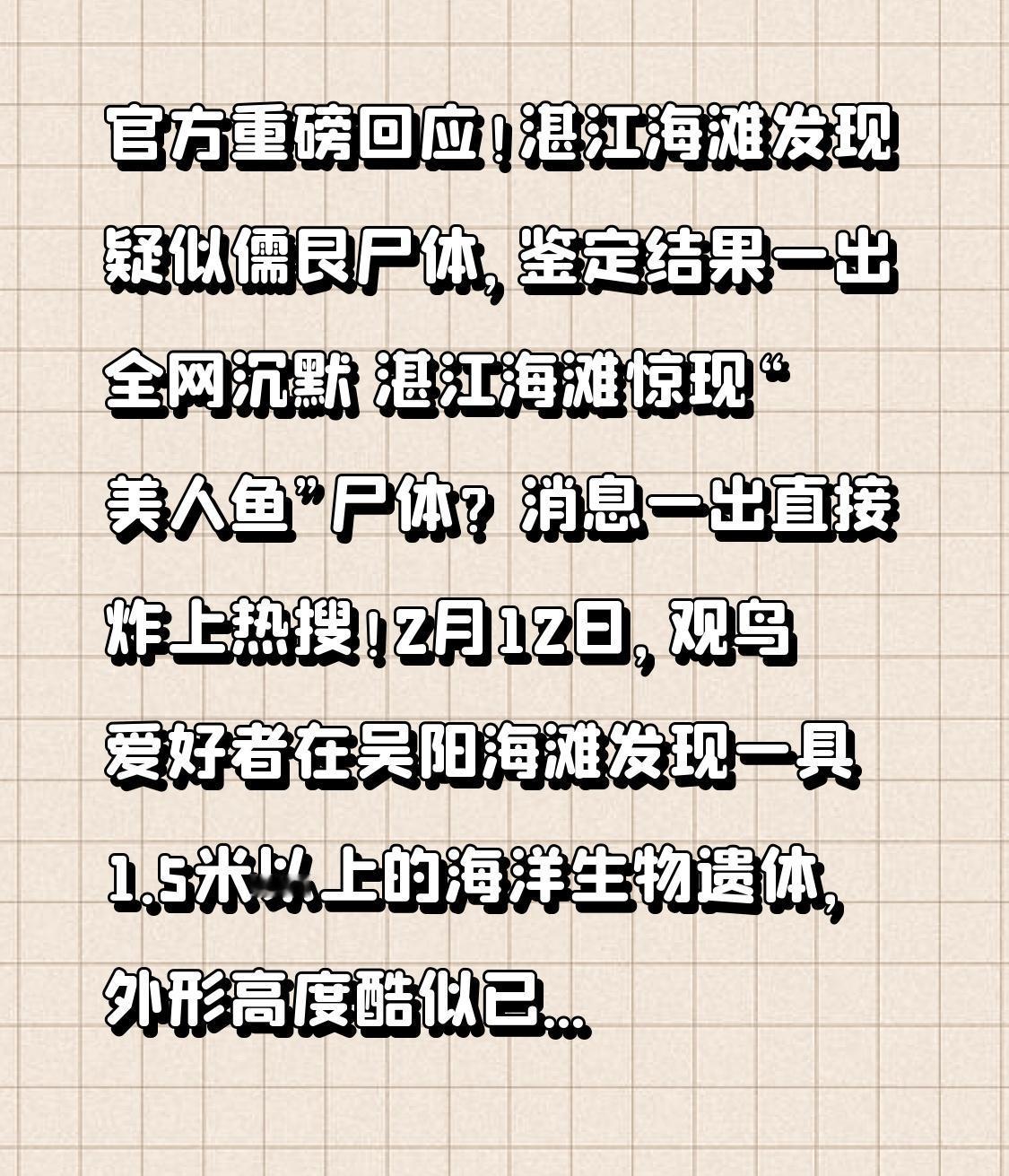 官方重磅回应!湛江海滩发现疑似儒艮尸体,鉴定结果一出全网沉默 湛江海滩惊现“美人鱼”尸体?消息一出直接炸上热搜! 2月12日,观鸟爱好者在吴阳海滩发现一具1.5米以上的海洋生物遗体,外形高度酷似已在我国功能性灭绝的国家一级保护动物——儒艮,瞬间牵动亿万网友的心。 大家既期待这是儒艮,证明种群重现;又心疼它以这样惨烈的方式出现,一时间全网揪心,都在等官方的权威结论。 转折点来了!湛江市海洋与渔业局联合中科院专家火速鉴定,官方通报正式出炉 经过对背脊、胸鳍、皮肤、生殖器官等关键特征比对,最终确认:遗体并非儒艮,而是雄性印太江豚,属于国家二级保护动物。因尸体腐烂严重、外形相近,才造成误判。目前遗体已按规定完成无害化处理,样本送检排查死亡原因。 一场乌龙,却让全网破防。 我们之所以如此紧张,是因为儒艮是传说中“美人鱼”的原型,温顺吃素,对海域环境极度挑剔。曾经畅游南海,如今却难觅踪迹,栖息地破坏、海洋污染、渔网误捕,正不断挤压海洋生灵的生存空间。 而印太江豚的非正常死亡,同样在敲响警钟。每一次搁浅、每一具遗体,都是大海在向人类发出警告。 这场乌龙也让我们看到:公众的海洋保护意识正在觉醒,从发现、报告到全网关注,每个人都在用自己的方式守护蓝色家园。 比认错物种更可怕的,是我们正在失去越来越多的海洋精灵。 少扔一片塑料,遵守禁渔规定,守护海草床与洁净海域,给它们一条活路,就是守护我们共同的蔚蓝。 别让美人鱼只活在传说里,别让江豚的微笑成为回忆。 支持保护海洋生态的,点赞转发,让更多人加入守护行列!