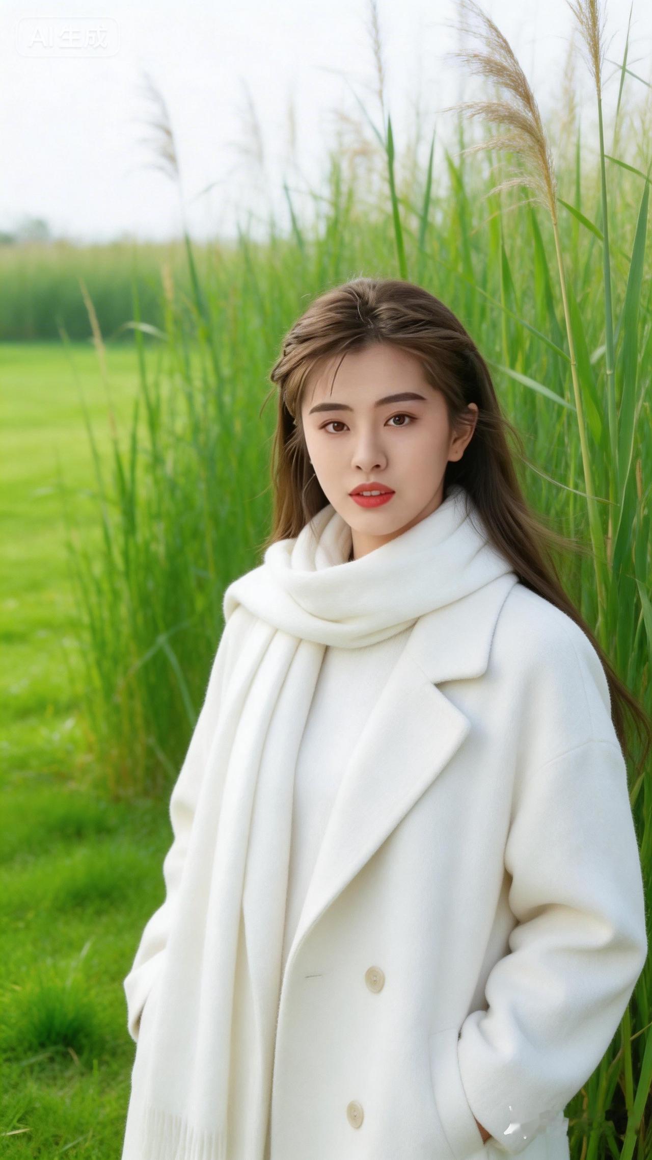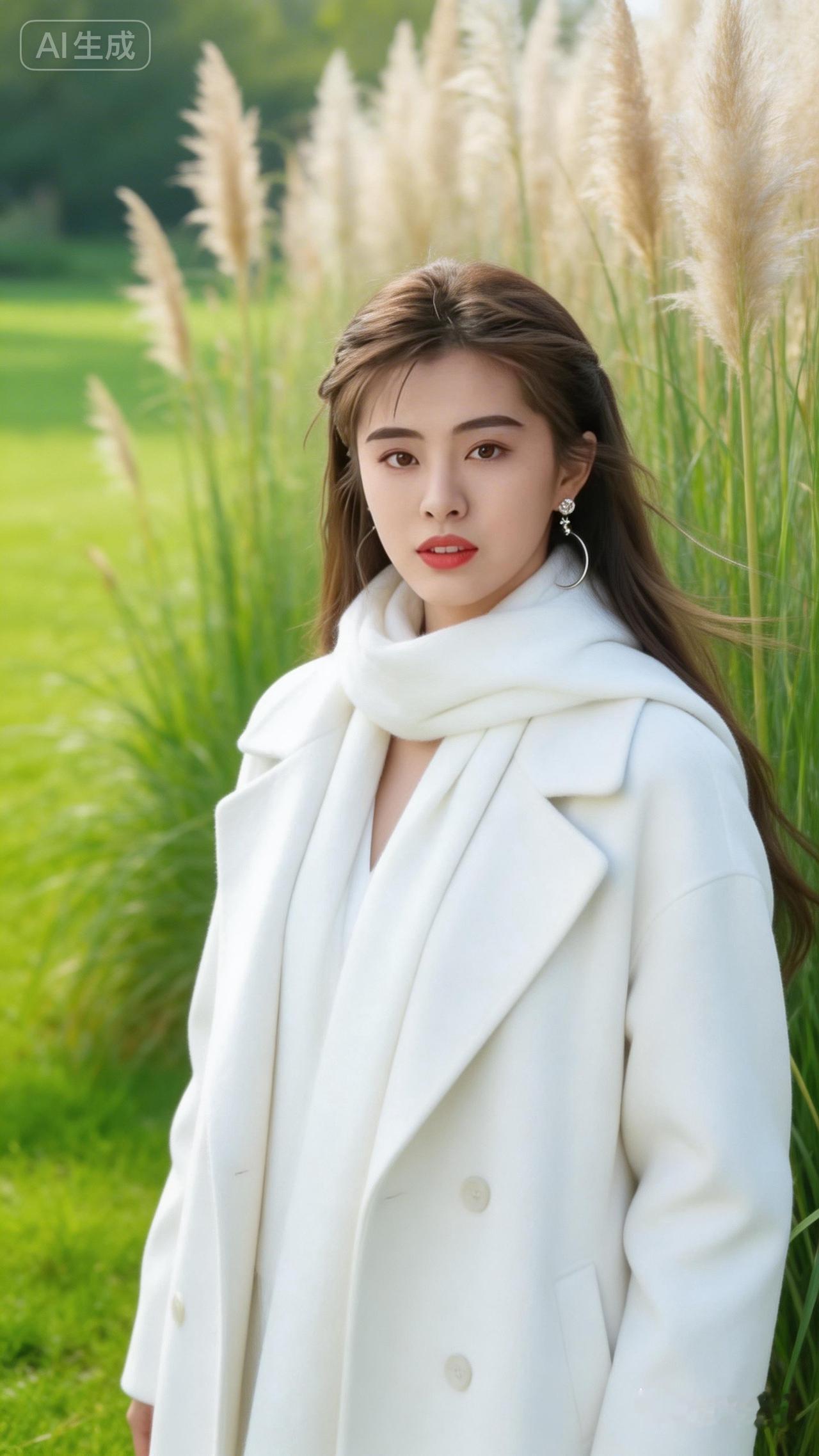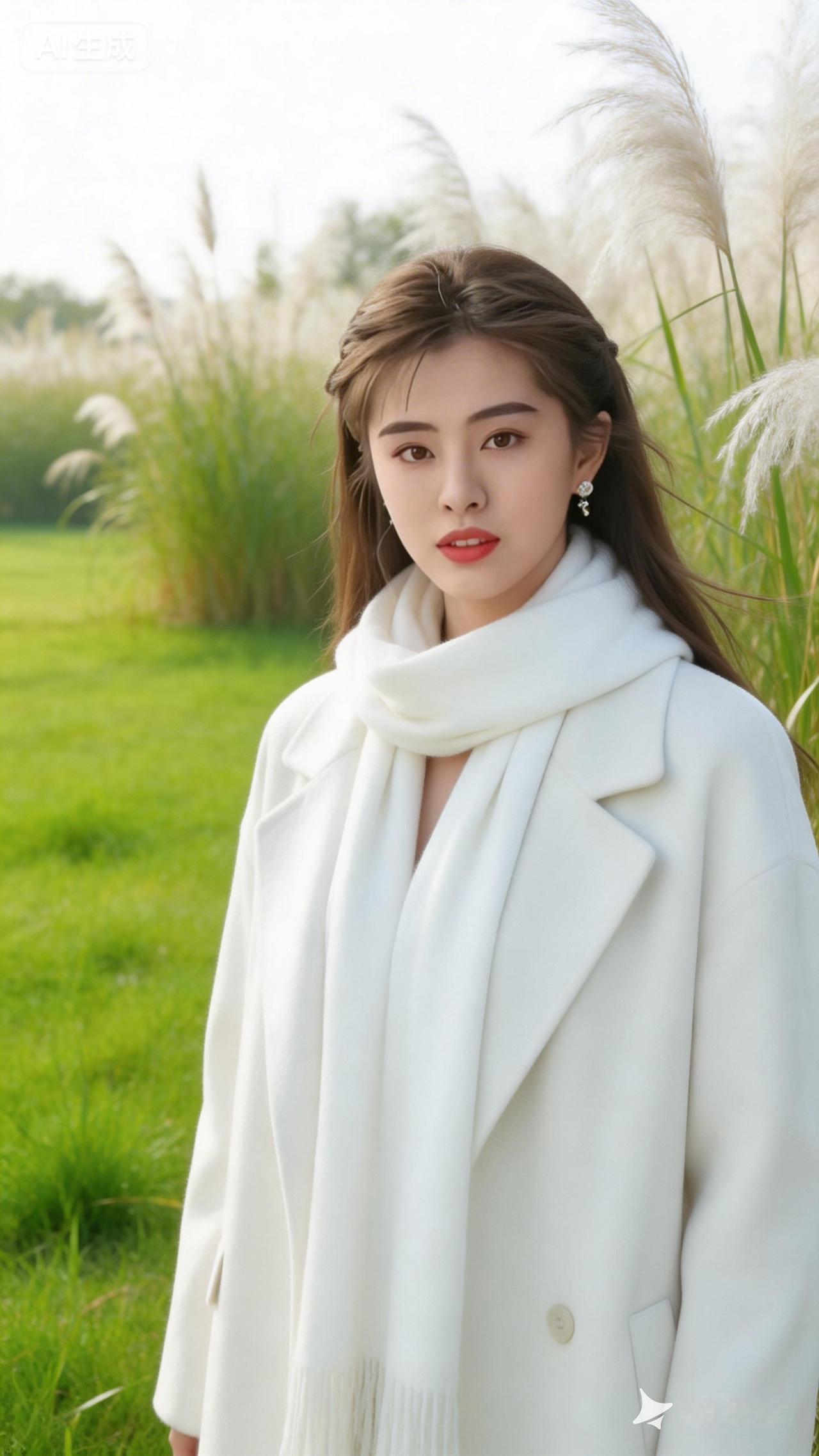 冬日暖阳下的优雅白衣女子,置身于绿意盎然的田野中,尽显自然之美。