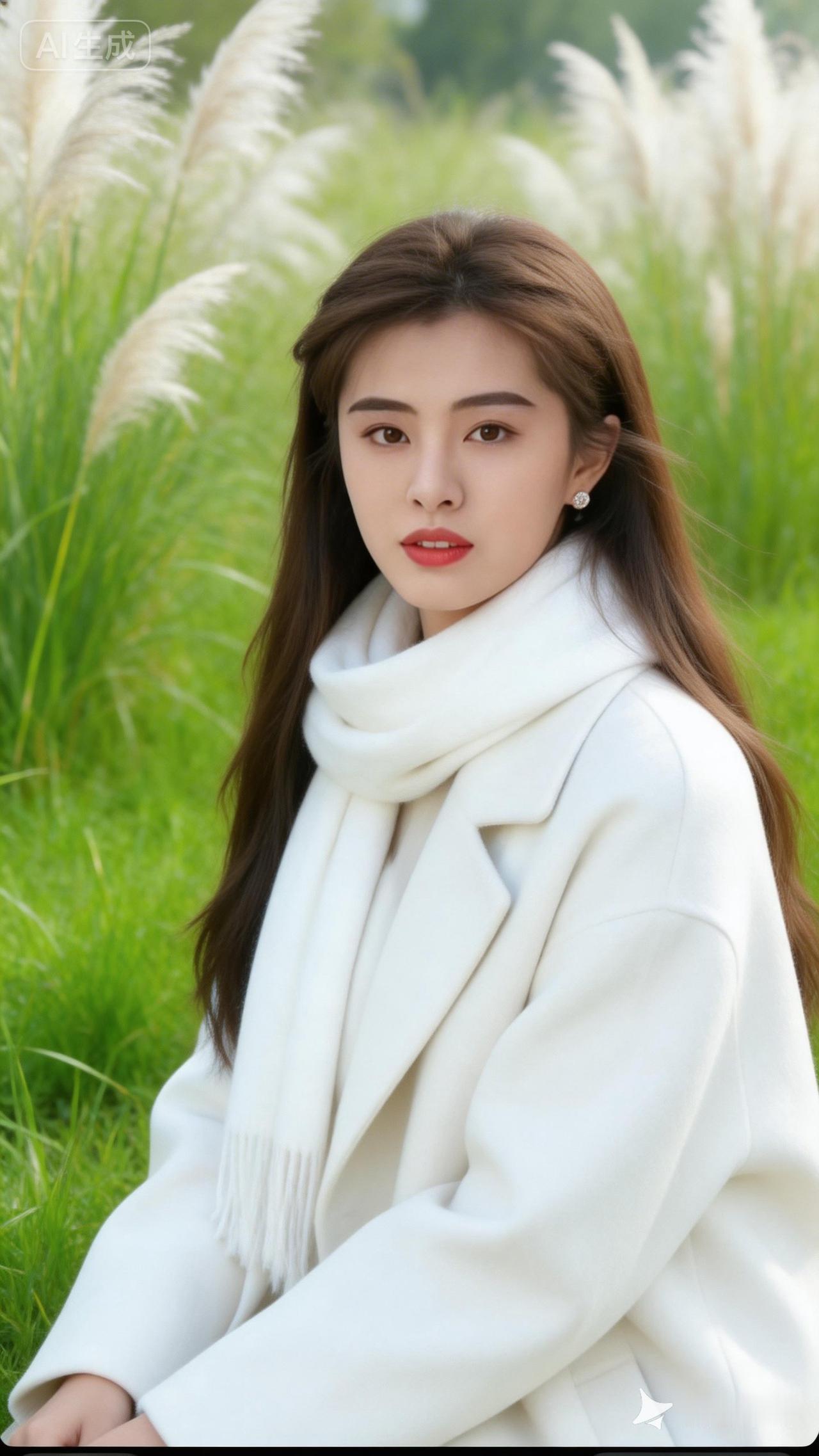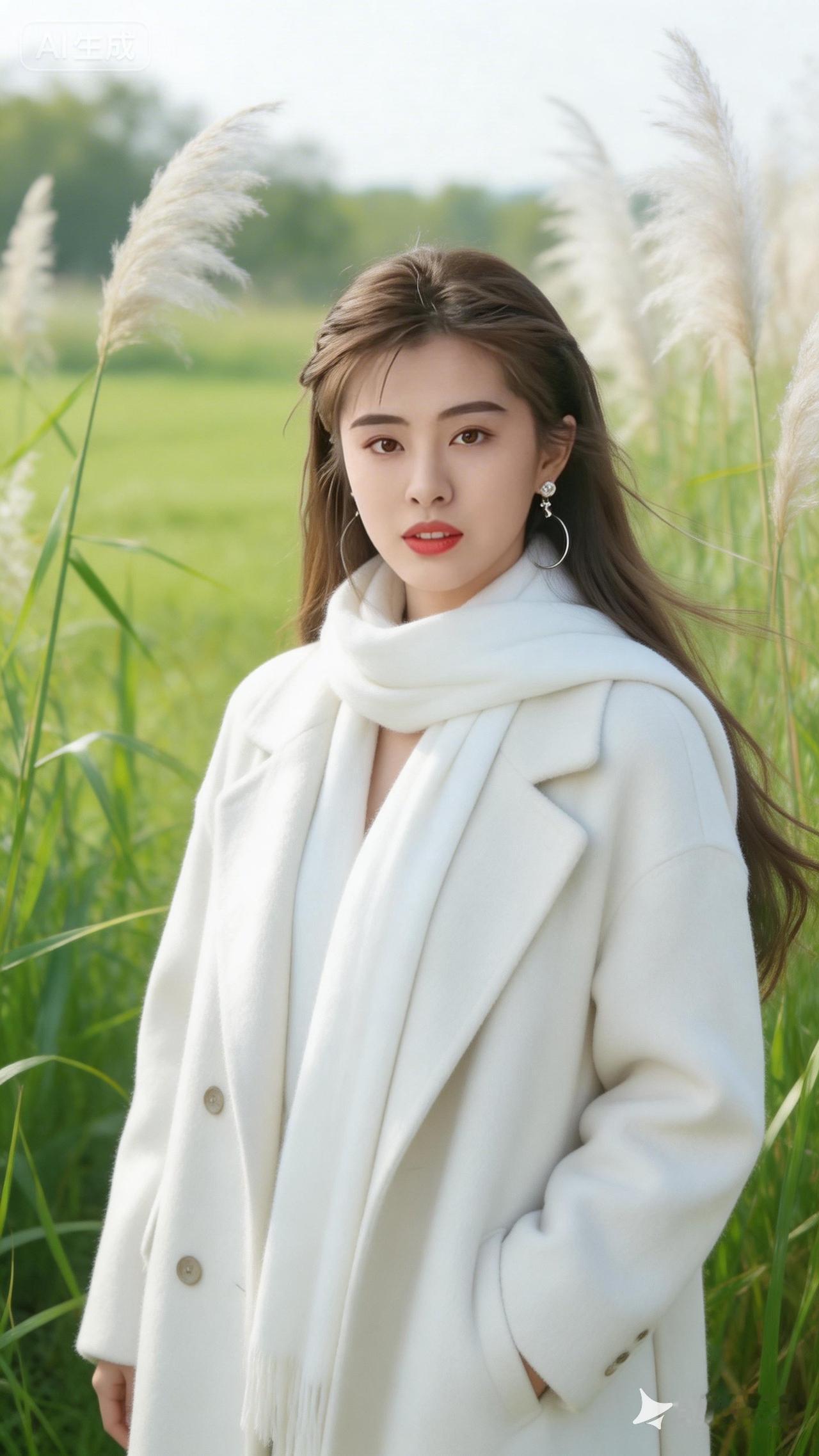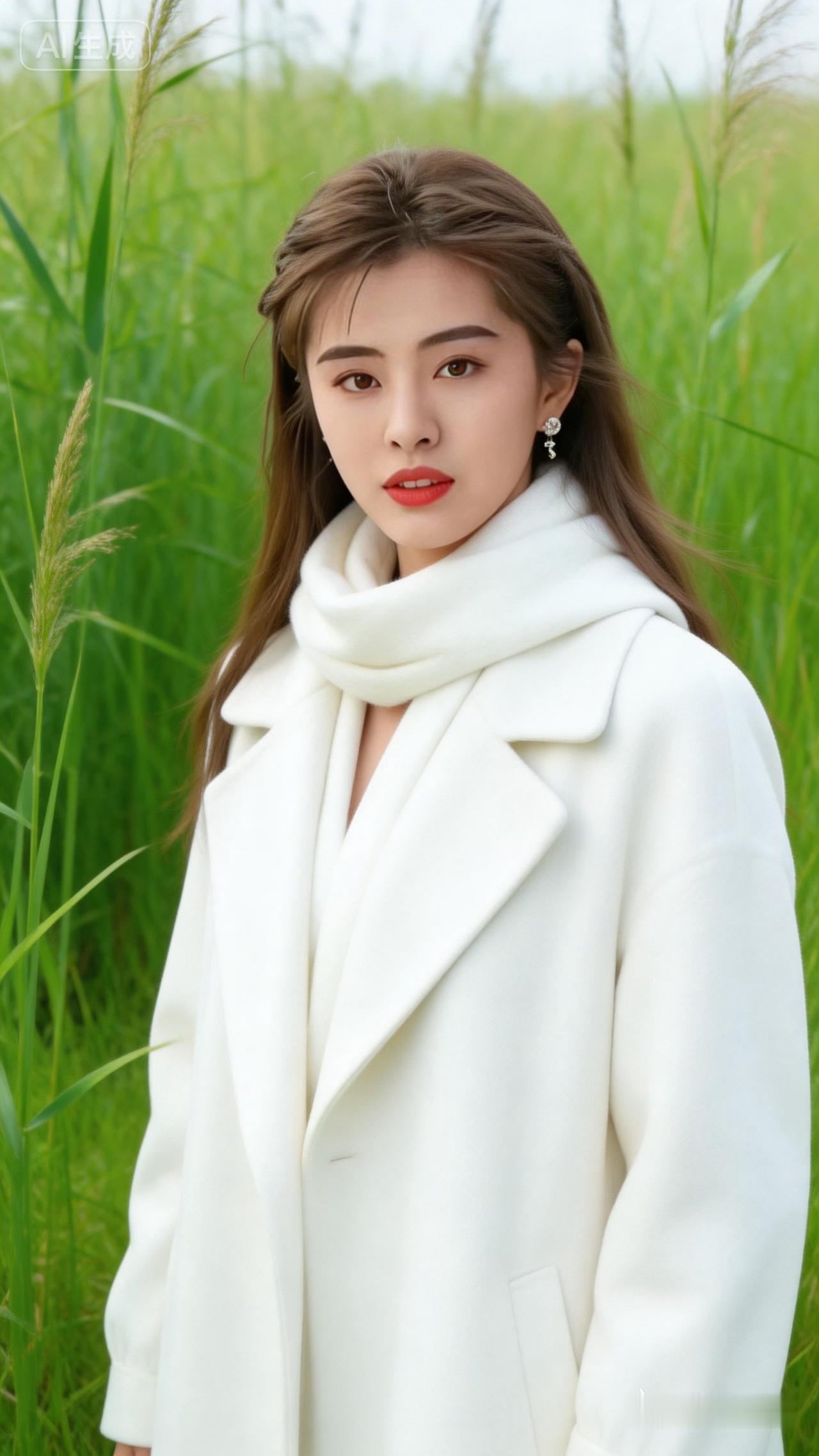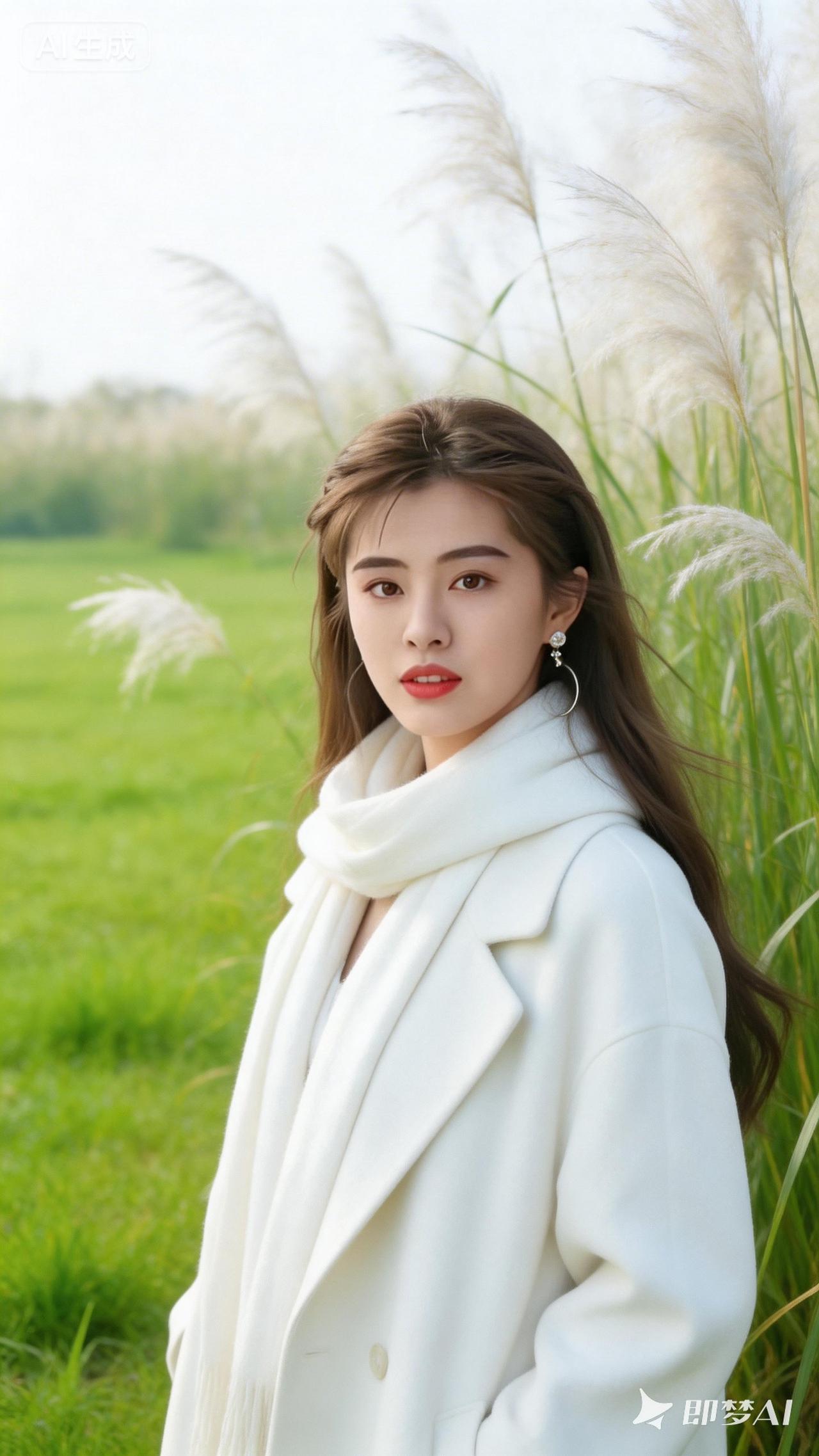 冬日暖阳下的优雅白衣女子,置身于绿意盎然的田野中,尽显自然之美。
