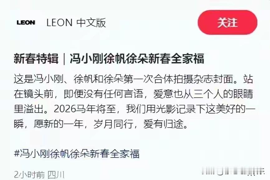 冯小刚徐帆徐朵新春全家福,他们一家三口拍杂志,为了证明母女感情好,徐帆徐朵特意拍了一组母女情深的照片。 徐朵的肢体动作就能看出,她更倾向于父亲冯小刚,她和徐帆关系一般,不然也不会三次甩开徐帆的手。 女人必须要有自己的孩子,孩子小时候是精神寄托,大了是依靠和底气,养女始终不是亲生的,血浓于水是永恒不变的真理。