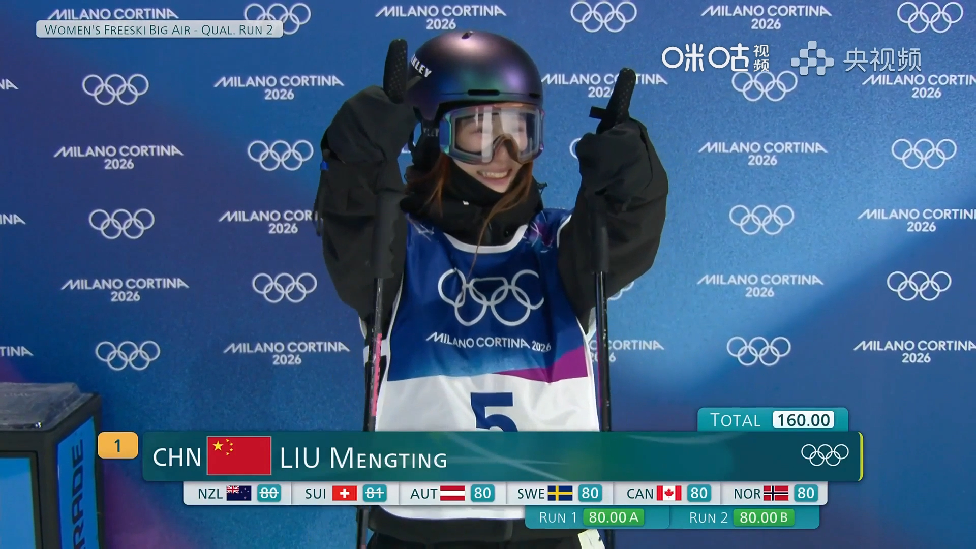 米兰冬奥会自由式滑雪女子大跳台预赛,🇨🇳第二跳:80.00 分,两跳总分:160.00分。 📺锁定为中国自由式滑雪女子天团加油助威。
