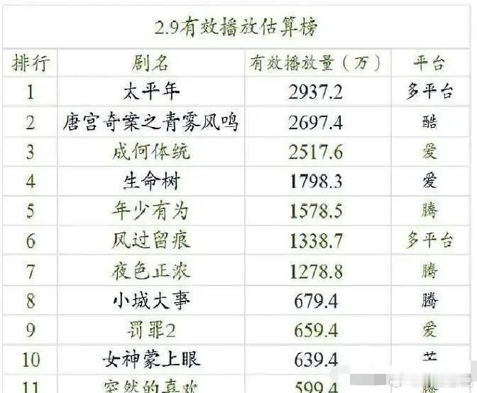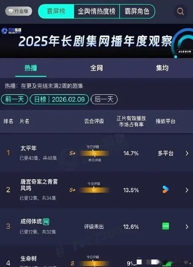 别再被热度骗了,这届在播剧又全军覆没。白鹿的《唐宫奇案》,在优酷号称热度73小时破万,结果一看单日播放量才两千多万。官方的播放量是平台自己公布的,时间是上周末到周一之间。别的平台同类型破万的剧,单日播放量一般在四千万以上。网友看了这个数据,质疑热度和播放量差距太大。《成何体统》被宣传成春节档的黑马,该剧主演是宋轶和佟梦实。热度在播放第三天冲到8800多,但这个数字之后没有再涨。平台数据显示播放量稳定在两千万左右,跟宣传说的“全网爆款”不符。杨紫主演的《生命树》在上线第一天播放量超过三千万,热度也在榜单前列。到了第四天,播放量降到两千万左右,第七天掉到一千五百多万。剧的更新节奏是每周二到周五,每天两集,数据下滑发生在第二轮更新前后。平台榜单上,《太平年》是白宇主演的古装剧,从上线到现在每天播放量都在三千万左右,占到榜单榜首时间超过两周。市占率一直在9%以上,最高一次到11%。但这部剧之外,其他剧的市占率都在这个区间里,没有明显高的。根据当天榜单,榜二到榜五的剧分别是《唐宫奇案》《生命树》《成何体统》和一部都市剧《她的一切》。这几部剧的热度差在300以内,播放量差也不大。榜单每天都会更新,但排名变动很小。目前几大平台在热播区都堆了十几部剧,宣发都打出“热度破万”“全民追”的口号。可是从数据没有哪部剧能像前几年那样拉开差距。