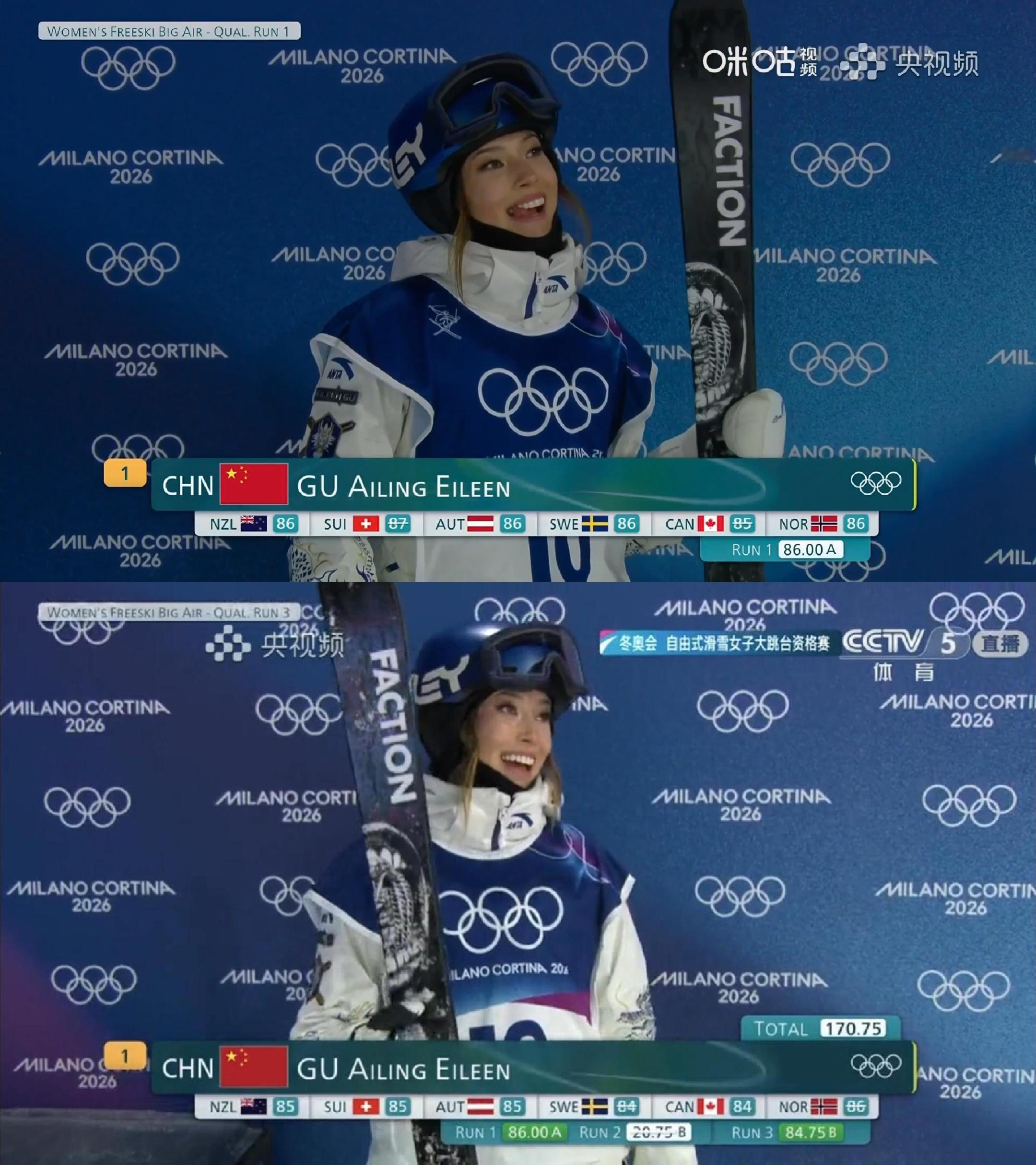 谷爱凌第2跳摔倒 又不是第二跳就结束有些人等不急投胎啊第三跳这不是来了吗86.00+84.75=170.75,谷爱凌第三跳84.75分