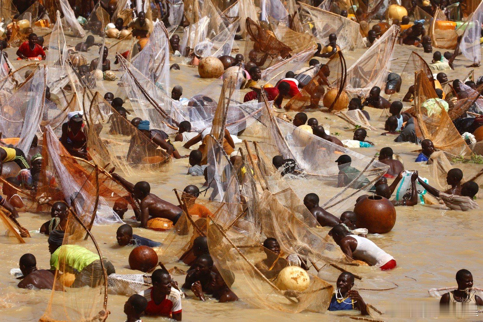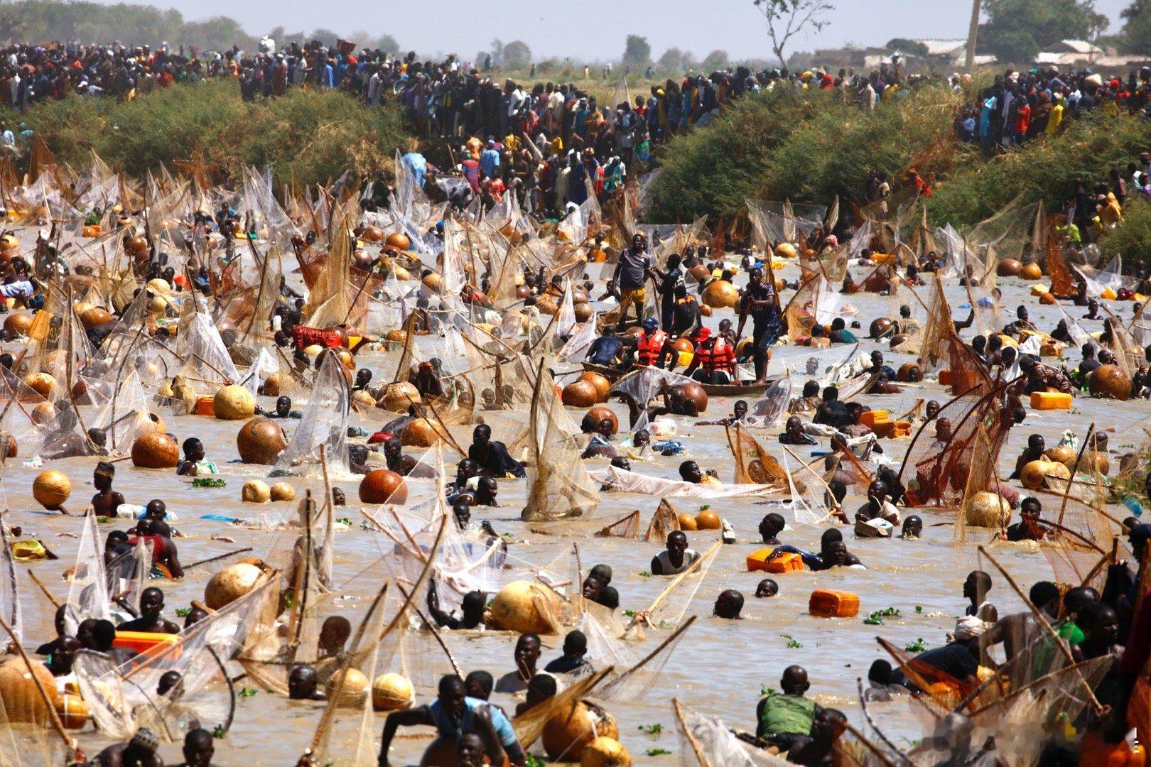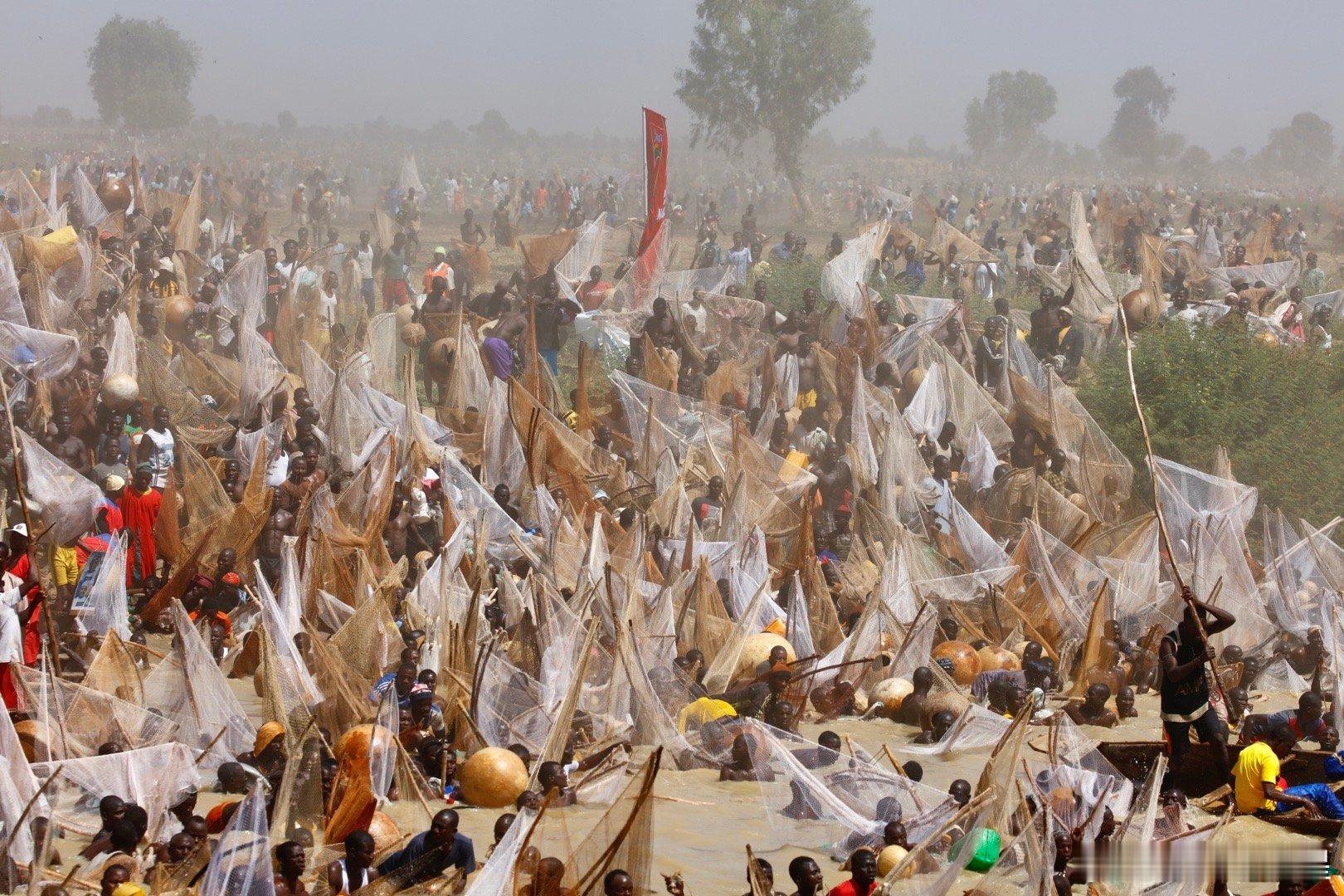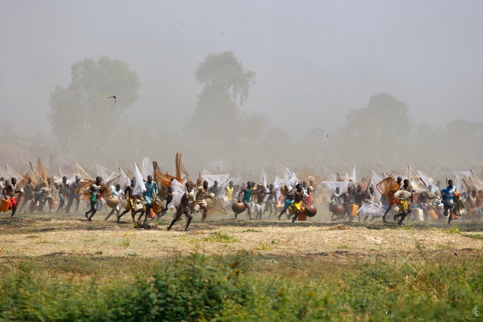 这个节日开始前,七万人远远的一字排开,然后一起跑步冲入索科托河捞鱼(图2-3),激起震天尘土。几万渔民在水里人满为患,就为了抢到最大的鱼王…