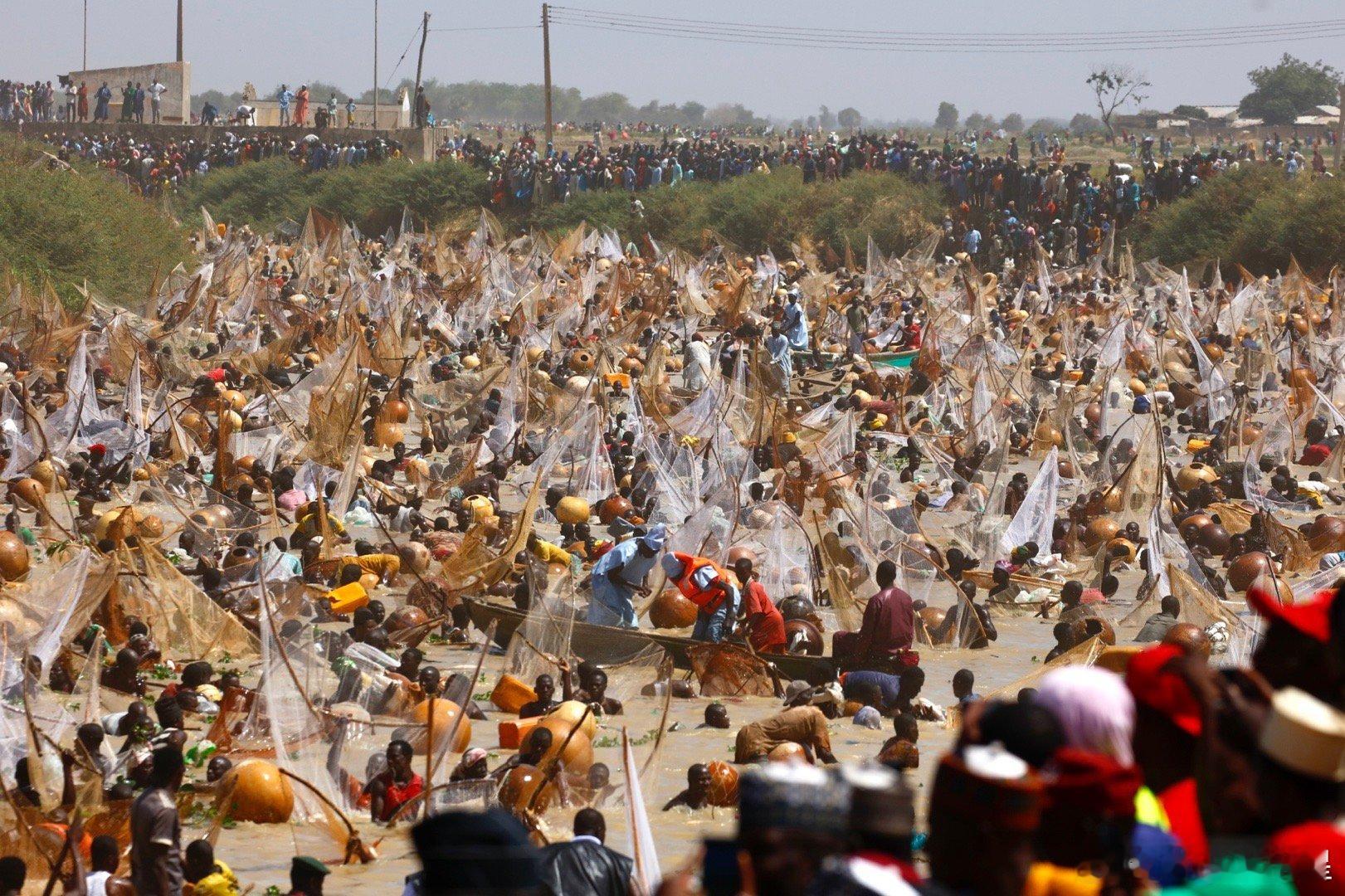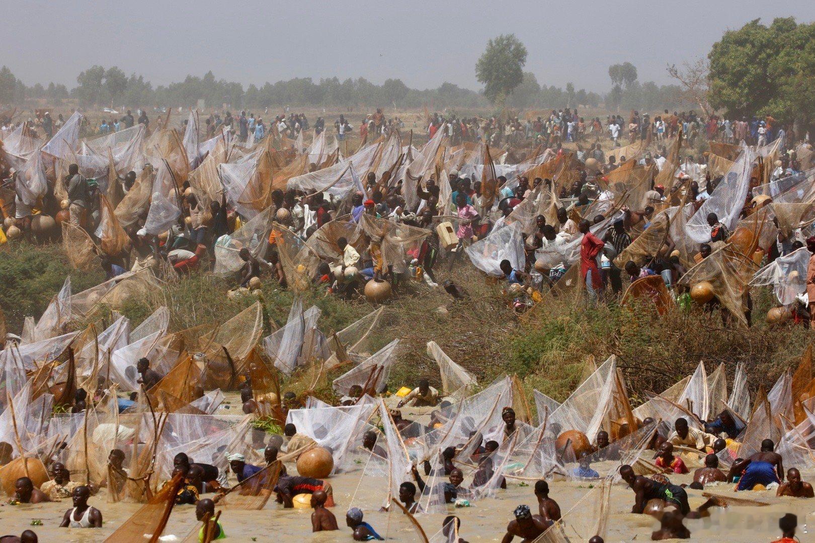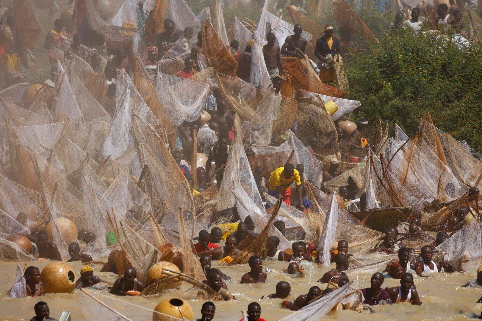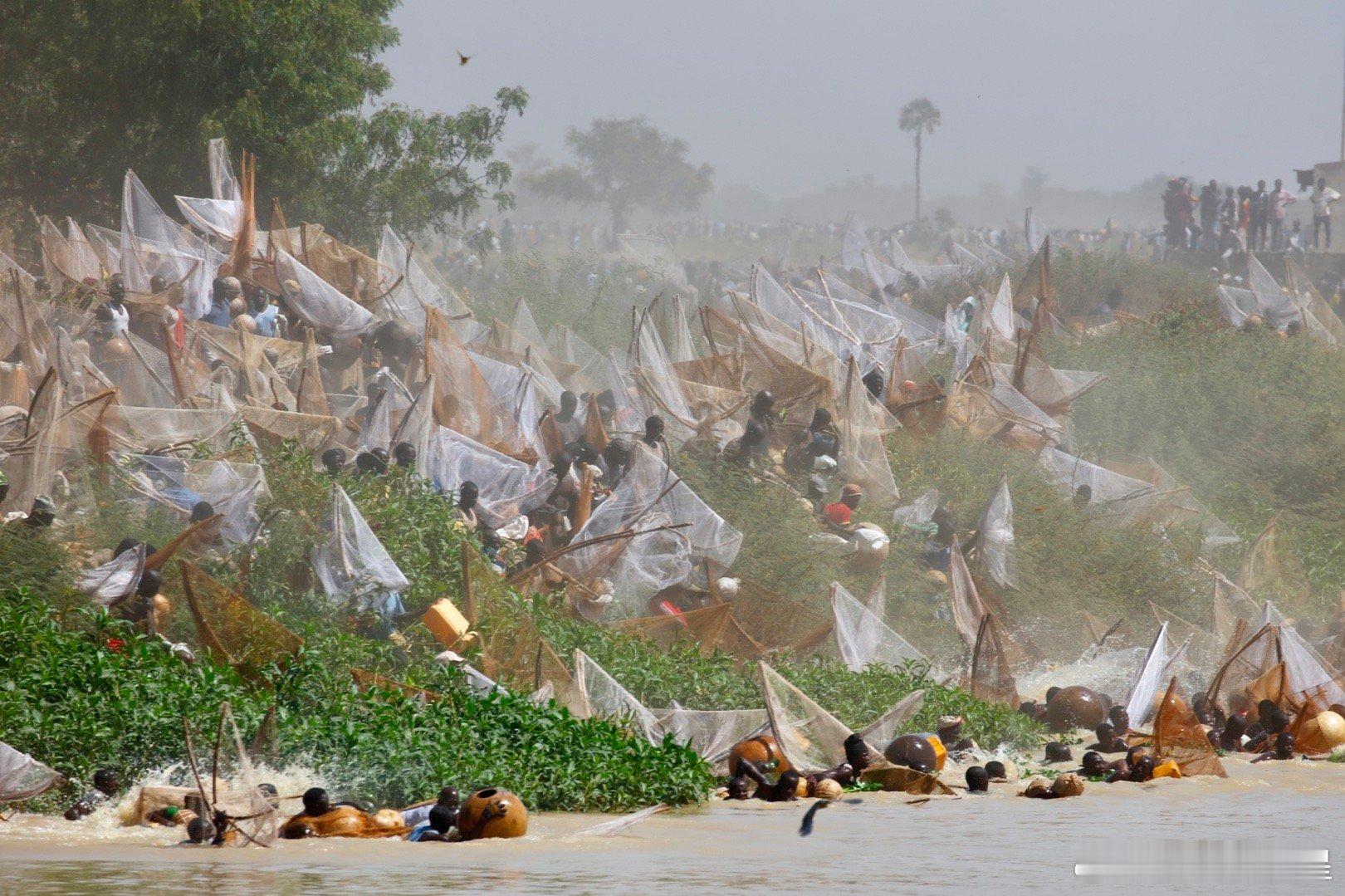 这个节日开始前,七万人远远的一字排开,然后一起跑步冲入索科托河捞鱼(图2-3),激起震天尘土。几万渔民在水里人满为患,就为了抢到最大的鱼王…
