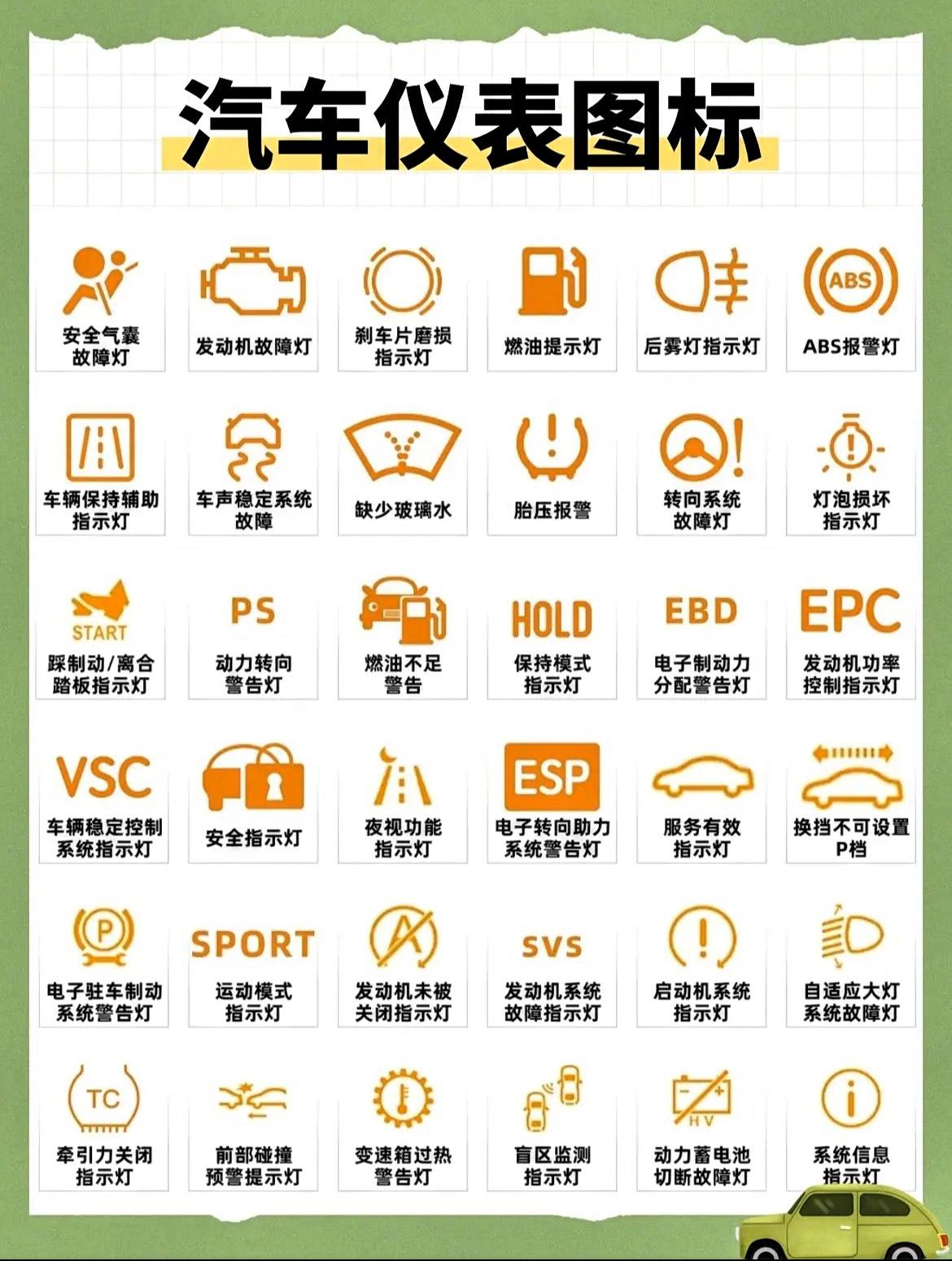 油车电车指示灯汇总,这些汽车指示灯小常识一定要了解。 安全气囊故障灯:看到小人和气囊的图案,就是安全气囊出问题了,赶紧检查! 发动机故障灯:发动机形状的灯亮起,可能动力系统出状况,别忽视! 刹车片磨损指示灯:圆圈里有感叹号和叉,表示刹车片快磨没了,行车安全很重要! 燃油提示灯:油桶图案,没油了,快找加油站! 后雾灯指示灯:云朵图案,后雾灯已开启,雾天行车必备! ABS报警灯:带字母ABS的灯,刹车防抱死系统出问题,雨雪天行车要注意了!
