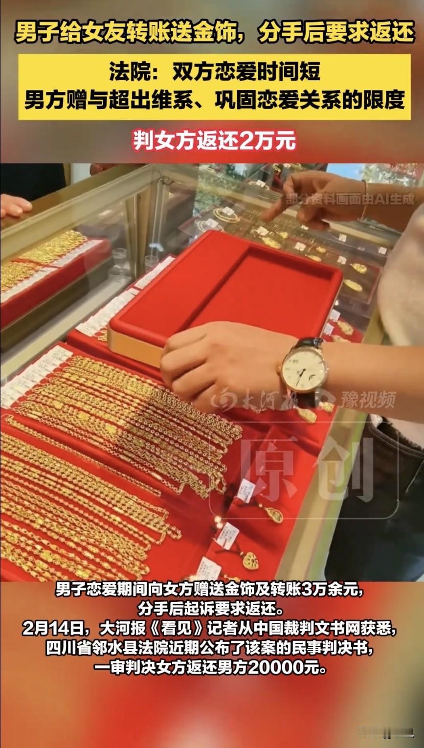 破防了!四川邻水一个男的,跟女的处了不到半年,转账加金饰花了三万多。分手后起诉要回来,法院判女的还两万。 两个人2022年1月30号在交友软件认识的,第二天就见了面。2月3号,男的跟女的还有她妈一起吃了顿饭,吃完饭俩人直接自驾出去旅游了。 从认识到出去玩儿,前后不到一周。 速度挺快。 2月5号开始,男的给女的转账。到7月26号,五个多月时间,一共转了29笔,30508块钱。 这里面有两笔比较特殊,一笔520,一笔188,是三八节那天转的。 除了钱,还买了两件金饰。一条项链4687块,说是确定恋爱关系的纪念。一枚戒指2243块,情人节礼物。 女的7月份把男的拉黑了,提出分手。 男的起诉到法院,要求返还三万块加两件金饰。 法院怎么判的呢。 520和188这两笔,属于表达爱意的一般赠与,不支持返还。 项链和戒指,虽然是纪念日和情人节礼物,但法院考虑到俩人恋爱时间太短,也没共同生活,男的转账和消费已经明显超出普通工薪阶层的能力,也超出维系恋爱关系的限度。 最后酌定,女的返还两万块。 法院没说这是彩礼,也没说这是附条件的赠与,就用了一个词,超出限度。 啥叫超出限度。 就是恋爱谈得短,钱花得多,分手了得退一部分。 这个案子有意思的地方在这儿。 以前这类纠纷,要么算彩礼,要么算一般赠与。彩礼得退,一般赠与不用退。现在法院多了一个尺度,看数额跟恋爱时间、共同生活情况匹不匹配。 匹配不了,就得退。 网上有人算了一笔账。29笔转账加两件金饰,三万五千多,五个多月时间,平均一个月花六千多。 谈个恋爱,一个月花六千多,确实有点多。 法院说超出普通工薪阶层的能力,就是这个意思。 那这个判决合理吗。 有人觉得合理,恋爱时间短,花这么多钱,分手了还回去应该的。 也有人觉得不合理,转账是自愿的,送出去的东西还要回去,没意思。 法院的态度是,恋爱期间的赠与,不是普通赠与。不能一句自愿就完事,得看双方的感情基础和经济状况。 这个案子里,俩人认识一周就一起出去旅游,旅游回来开始密集转账,五个月后分手。感情有多深,钱花得值不值,法院没法判断,但能判断的是,时间太短,钱太多,这种情况需要保护一下出钱的一方。 还有一点,男的转账里有不少是日常生活开销。女的没上班,男的作为男朋友愿意负担,这部分法院没让退。 但超出日常生活需要的大额转账,就得退。 这个区分也挺细。 日常生活开销,一块儿吃饭、买东西,花了就花了,不还。 大额转账,比如一次转几千上万,这种得还。 项链戒指,虽然是礼物,但价钱在那摆着,也得还一部分。 法院这个两万块的数字,就是这么凑出来的。 你看完这事啥感觉。 谈恋爱花的钱,分手该不该还。