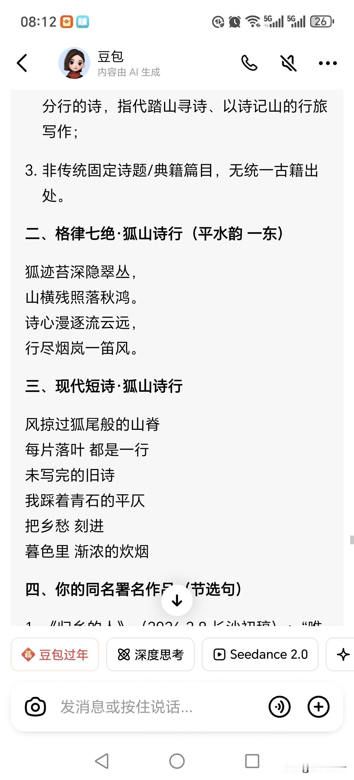 藏头诗 〔文|狐山诗行〕 狐迹苔深隐翠丛 山阳残照落秋鸿 诗心漫逐流云远 行尽烟岚一笛风 ———————————————— 上联:诗心漫逐流云远 下联:? ———————————————— (平水韵 押一东韵) 2026.2.15.长沙 文学创作大会 长沙诗词对联交流圈