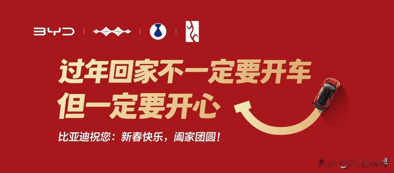 过年回家不一定要开车,但一定要开心! 经常听到有人问:“今年开什么车回家才有排面”,答案各有不同,但比亚迪今年的祝福语,我觉得是最完美的答案:“过年回家不一定要开车,但一定要开心。” 每年春节,在外工作的游子都会回家,有的开车、有的乘坐大巴车、有的乘坐飞机、有的乘坐火车,甚至有的不远千里驾驶摩托车,他们都有一个目的,与许久未见的家人团聚,享受亲情,获得内心的满足。 不知道从何时起,春节的一些祝福有些变味了,总觉得功利性特别强,有种高高在上的感觉。但2026马年,比亚迪的春节祝福,只用了短短两句话,就拉近了企业与所有人的距离,让人看了之后莫名的亲切,没有产品卖点、没有出行劝导,更没有品牌说教:「过年回家不一定要开车,但一定要开心」,「比亚迪祝您:新春快乐。阖家团圆!」。 春节伴随的是春运,万千游子焦急的等待列车,路途中怀揣喜悦与期待,需要的被祝福与认同,从比亚迪的祝福语中,大家能够切身体会到真心的祝福,体会到比亚迪在冬季给大家带来的“温暖”,真心祝愿每个人新年常开心!