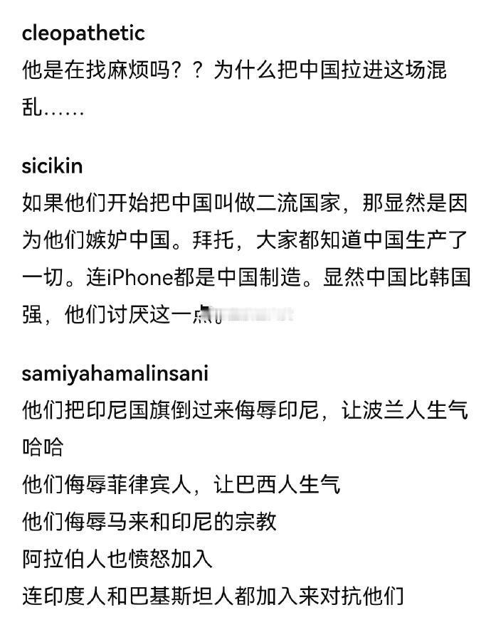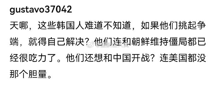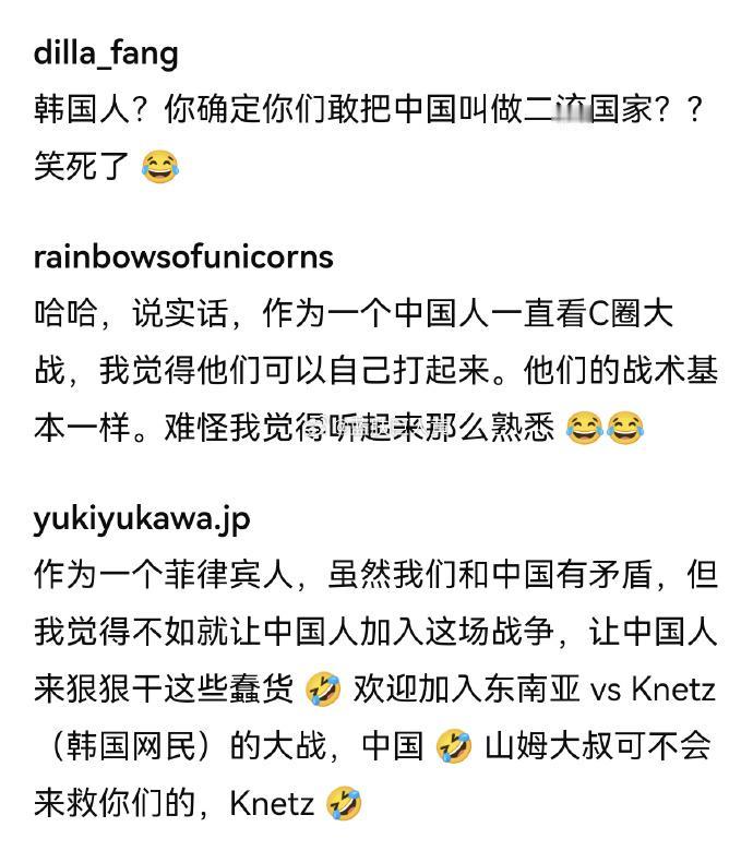 韩国人竟然敢说“中国是二流国家”,东南亚诸国:“终于把中国拖进来了” “你们怎么敢这么说中国?” “中国在“嘴炮”方面比东南亚狠多了”“让中国人来狠狠干这些蠢货” 东南亚和韩国网络大战,有韩国人认为中国站东南亚,于是怒骂“中国是二流国家”, 韩国人怼天怼地怼空气,可惜自己太袖珍, 中国网友本来是负责吃瓜的,韩国人非得来踩一脚, 这下也得加入战局了,韩国人准备好接受洗礼了吗?