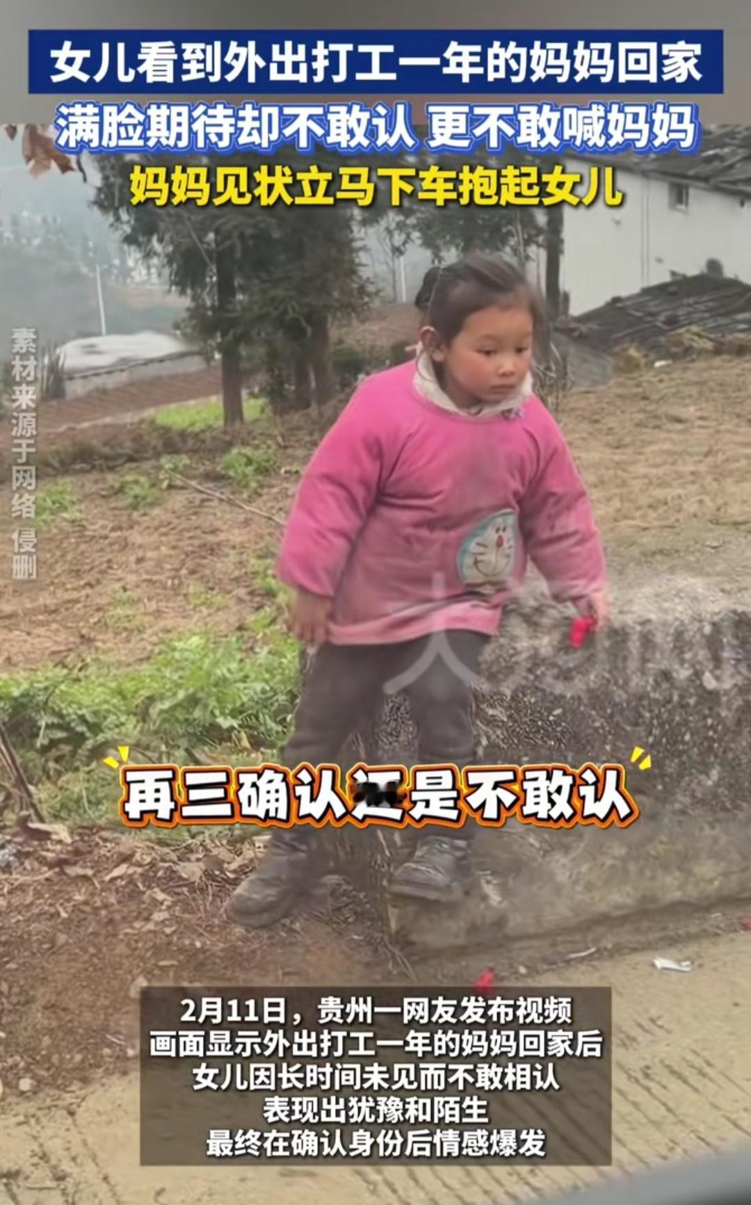 是不是所有的思念,到了相见那一刻,都会变得怯生生的?刷到一个戳心的视频,外出打工一年的妈妈终于回家,女儿远远看着满心期待,可真见了面,却怯得不敢认,连一声妈妈都喊不出口。 孩子的眼里藏着藏不住的想念,可一年的分离,让那份亲近多了几分陌生,期待的小脸上,满是无措和胆怯。 妈妈一眼就懂了孩子的心思,见状立马下车把女儿紧紧抱起,这个拥抱,该是化解了所有的生疏和不安吧。为了生活的别离,总是藏着太多无奈,孩子的这份小心翼翼,何尝不是留守儿童心底最真实的模样。