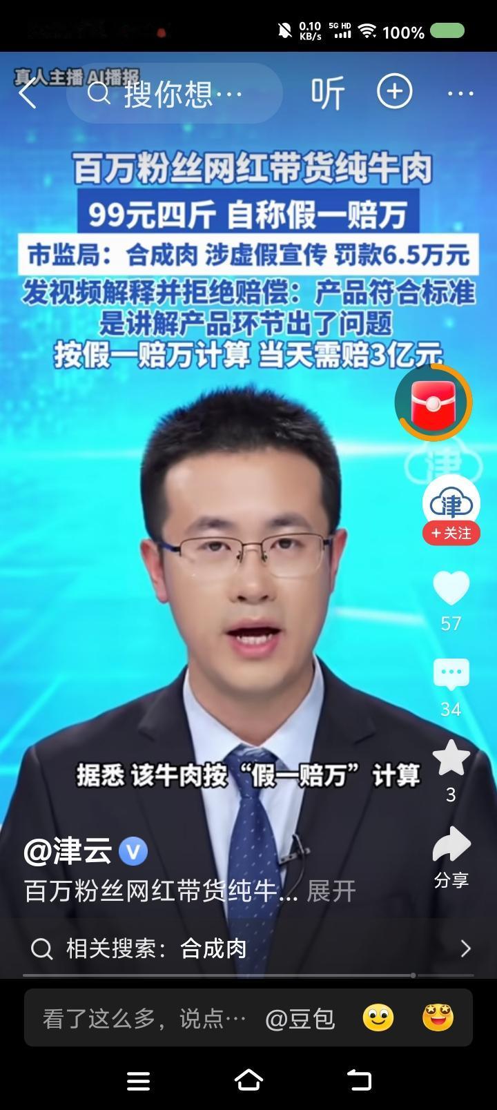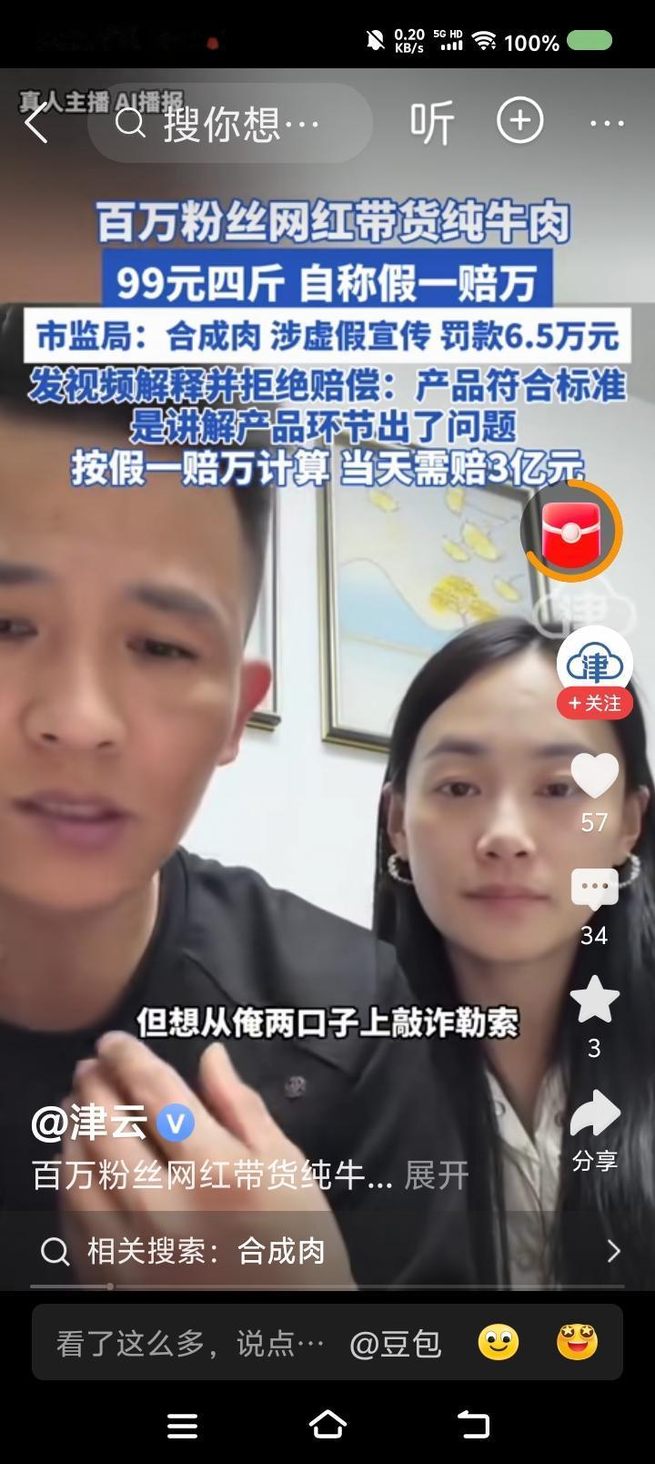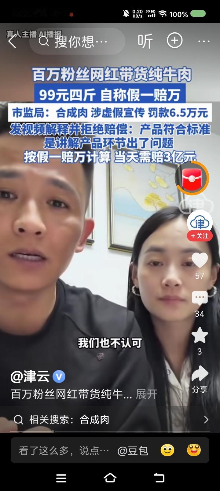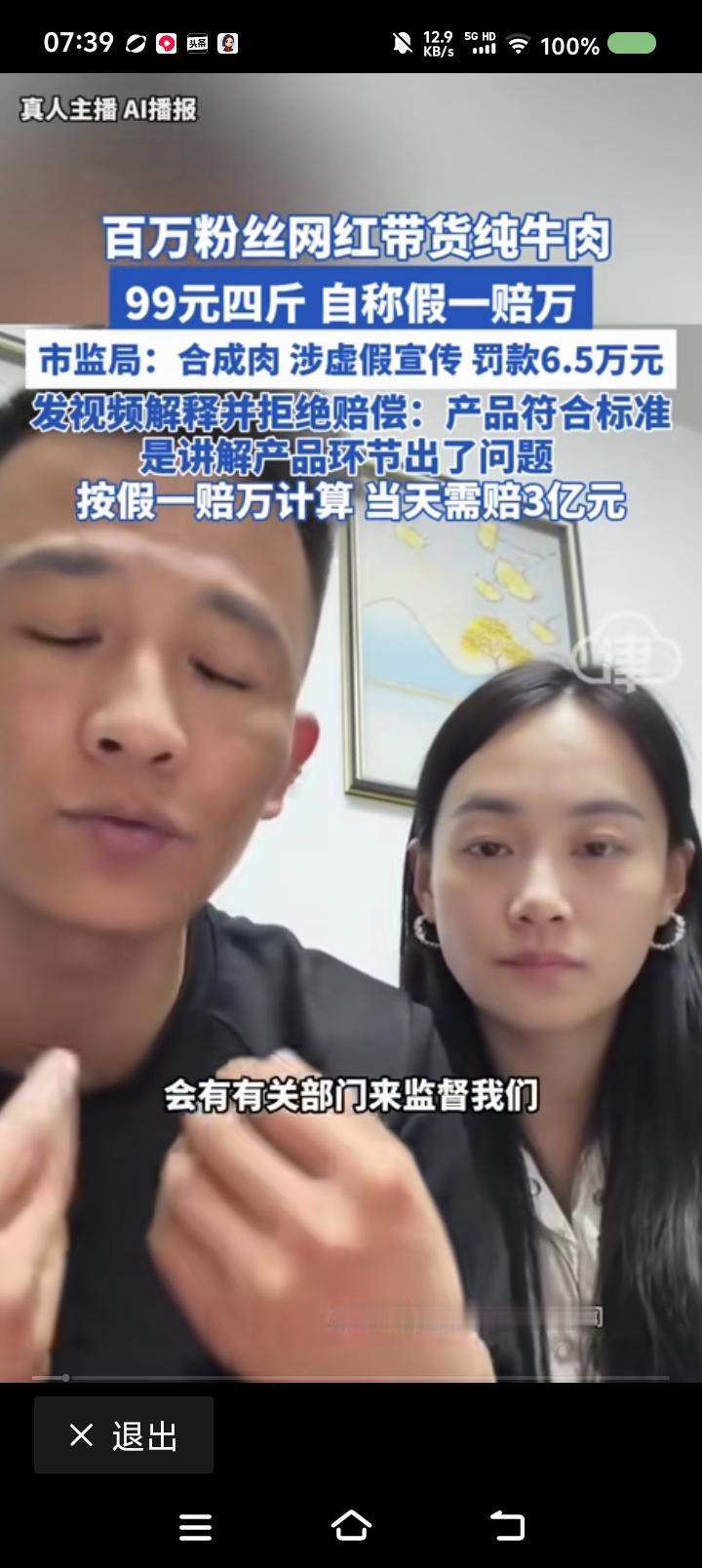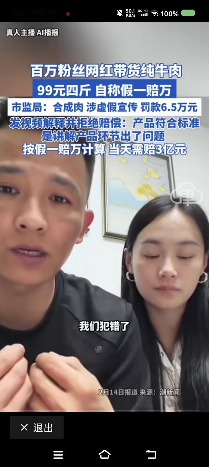 法律的“不公平”,我终于找到了—— 据报道,某网红直播卖纯牛肉,自称“假一罚万”。结果,产品有问题,是合成肉,遭有关部门处罚6.5万。他辩解产品符合标准,讲解产品环节出了问题,“我们犯错了,会有相关部门监督我们,但敲诈勒索我们两口子,我们不认可。” 如果按他承诺的“假一赔万”,他当天需赔三亿元。 点评: 一、中国消费者,是弱势群体。 二、产品“符合标准”?你确定? 三、我特别喜欢看一些人对自己犯错或违法的态度,因为世界上最伟大的文艺作品有时也反映不出人性的深邃。 四、当法律对有些人有利时,他们开始讲法律了;当流量对他们有用时,他们开始许诺了;当道德对他们有用时,他们开始讲道德与情怀了。而受害者,已经抚不平忧伤了,法律的“局限性”,显示出来了。 五、他们再出发时,还是有粉丝支持的,为什么?人性的悖论。