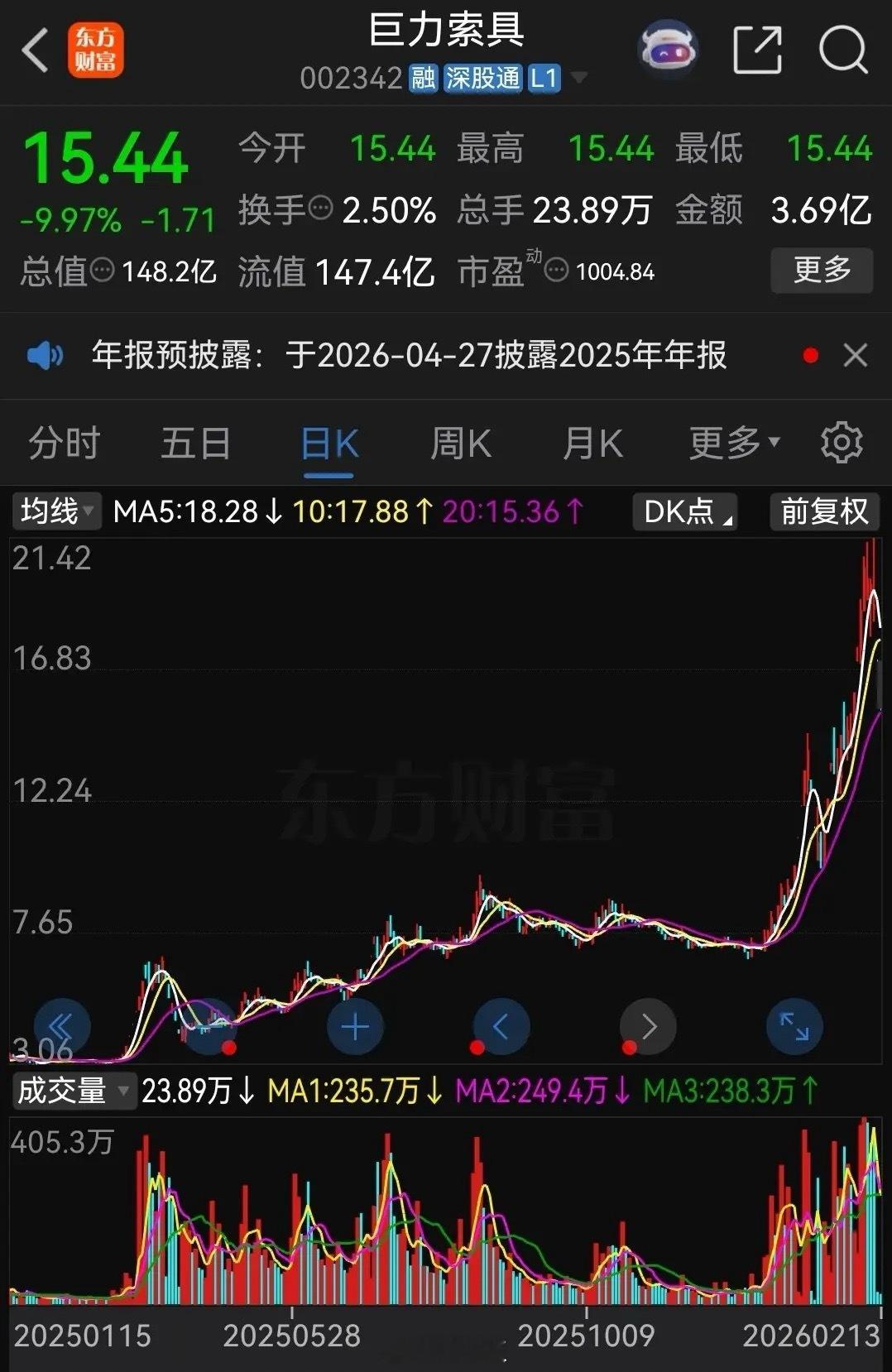 巨力索具在去年3月份的时候,股价只有3元左右,去年因为海洋经济就爆炒过一波,后来股价一直震荡上行,最近几个月又蹭上了商业航天概念,股价再次被爆炒,2月11日股价最高涨到了21.42元,不到一年时间股价暴涨了7倍。