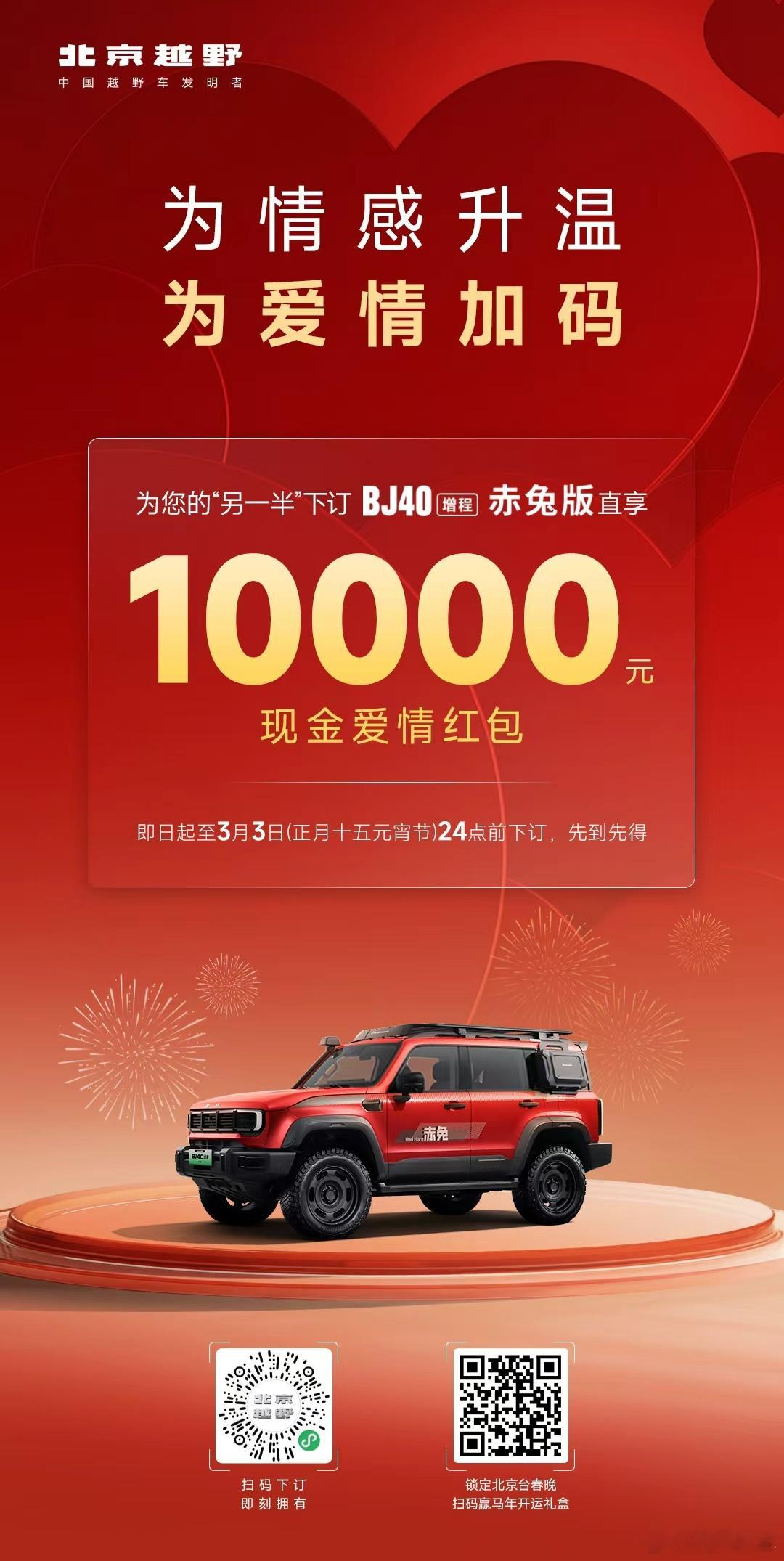 [爱心]为情感升温 为爱情加码[爱心]为您的“另一半”下订BJ40增程赤兔版,直享北京越野10000元现金爱情红包!💝锁定北京台春晚,赢马年开运礼盒💝