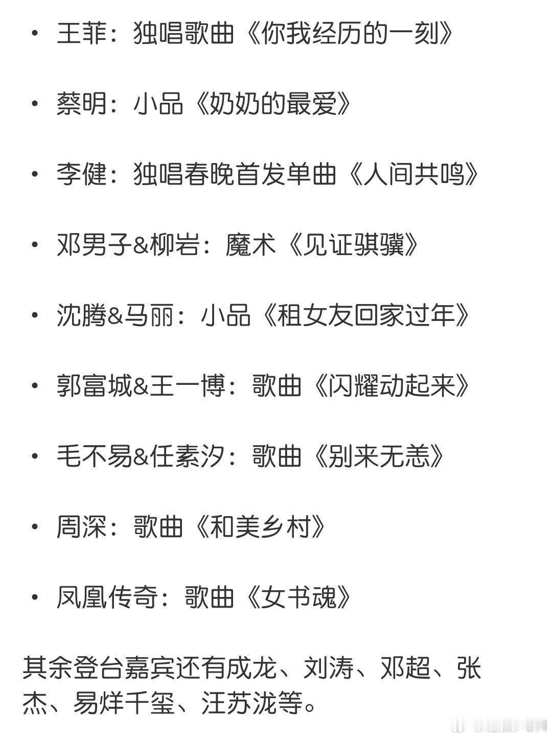 马年春晚部分节目单曝光 目前曝光的节目最期待是沈腾马丽的小品,还有郭富城王一博的歌曲,肯定很动感!