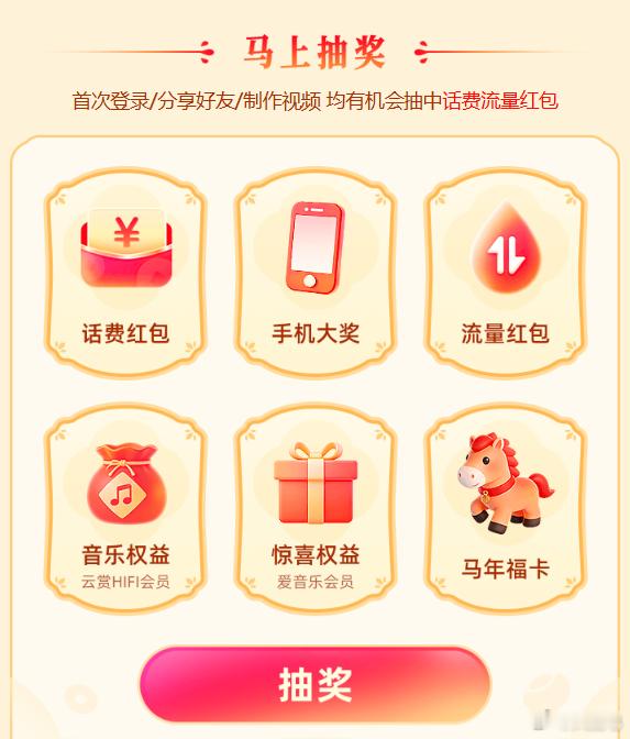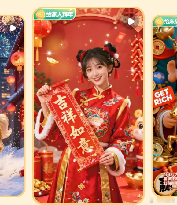 AI过新年马上有福 真好,我看很多人已经到家了,到家就是年~那么除了家里的年味外,「赛博」年味现在也不能少。电信用户现在可以用天翼智铃生成各种视频、表情包了,这个是利用AI能力实现的,包括一键生成马年的祝福语,还有祝福视频。如果说过去是发短信打电话拜年,那现在就是用AI了~真是AI改变生活。我看了一下生成的效果,动画的效果特棒,很可爱,写实风格也会很贴近生活,就很有情绪价值。关键,还能抽奖。