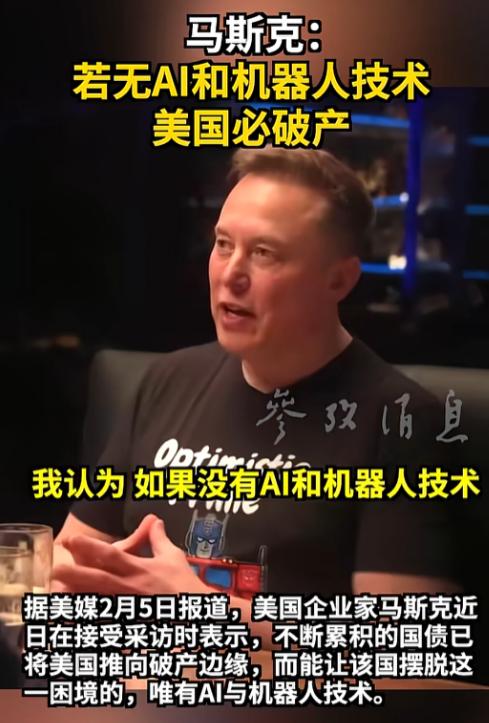 科技界的“顶流”马斯克又一次凭借大胆言论抢占了热搜,在一次公开采访中,他毫不避讳地指出,美国的国债问题已经严重到了“离谱”的程度,每年仅需支付的利息就超过一万亿美元,这一数字甚至超过了国防预算。 他甚至毫不避讳地指出,美国实际上已经一只脚踩在了破产的悬崖边上。 面对这个看似无解的债务黑洞,马斯克对传统的财政手段,如削减开支或增加税收,嗤之以鼻,认为这些方法根本无法触及问题的核心。 而在他看来拯救美方经济的唯一出路是人工智能和机器人技术。 马斯克坚信,只有依靠AI和机器人实现生产力的飞跃,才能创造出足够庞大的经济增量,从而跑赢债务增长的速度,最终填补这个巨大的窟窿。 除此以外,他还特意提到了自家公司特斯拉正在研发的Optimus人形机器人,将其视为推动GDP增长、扭转经济颓势的关键力量。 虽然不少人认为马斯克是在危言耸听,刻意制造话题,但平心而论,他的观点并非空穴来风,美国的债务问题确实是悬在全球经济头上的一把利剑。 而AI和机器人也确实代表了未来生产力发展的核心方向,作为科技领域的意见领袖,他的这番话无疑会引发广泛的讨论和思考。 当然,我们也必须保持清醒的头脑,技术从来不是解决所有问题的万能钥匙,AI和机器人能否真正成为美国经济的“救世主”。 不仅取决于技术本身的突破,更与社会制度、产业政策、全球竞争格局等一系列复杂因素紧密相关。 其实马斯克的言论,更像是一记响亮的警钟,既警示了债务问题的紧迫性,也为未来的发展勾勒出一条充满未知与挑战的技术路径。 归根结底,美国经济的未来走向无人能精准预测,但可以确定的是,AI和机器人技术正在以前所未有的速度重塑世界。