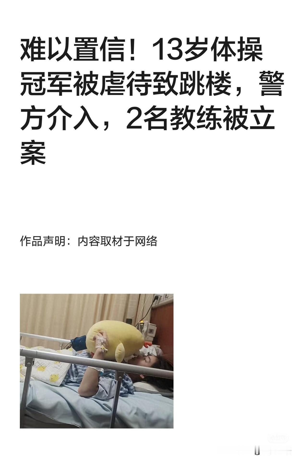 13岁的体操姑娘傅佳丽,有天赋也拿过冠军,本该在训练场好好追梦,却被教练的虐待逼到崩溃跳楼。 常年的身体打骂,难听的脏话羞辱,就连生病都被教练逼着训练,孩子一次次跟妈妈哭诉害怕,可妈妈为了所谓的前途,选择妥协,还按时给教练交钱,想着能让孩子少受点苦。 可这份妥协,换来的却是教练的得寸进尺。一个动作失误,就被保温杯砸肩膀,被骂废物、活着浪费空气。 深夜里,小姑娘从四楼一跃而下,摔成重伤,肺挫伤、肋骨折了,脾脏也破了,躺在病床上奄奄一息。 真的太心疼了,孩子的前途再重要,也比不上健康和性命啊。父母本是孩子最坚实的后盾,可这份妥协,却成了压垮孩子的一根稻草。 任何时候,孩子的感受都该放在第一位,被欺负了就该站出来,而不是让孩子独自承受所有的伤害。 一直对各种体育比赛不感兴趣的原因,就是觉得号召全民锻炼的价值,在于适当运动有利于身体健康。但每年各种体育项目比赛,就把“健康”变质了,不知道孩子跳楼之前有多绝望……