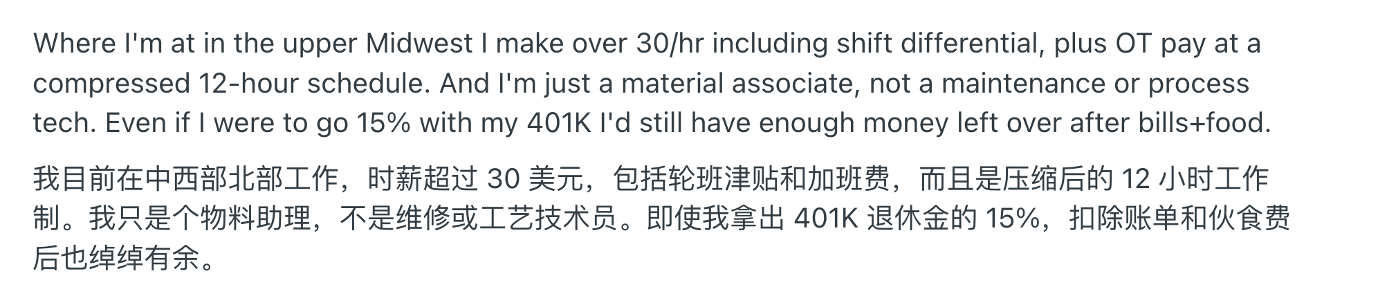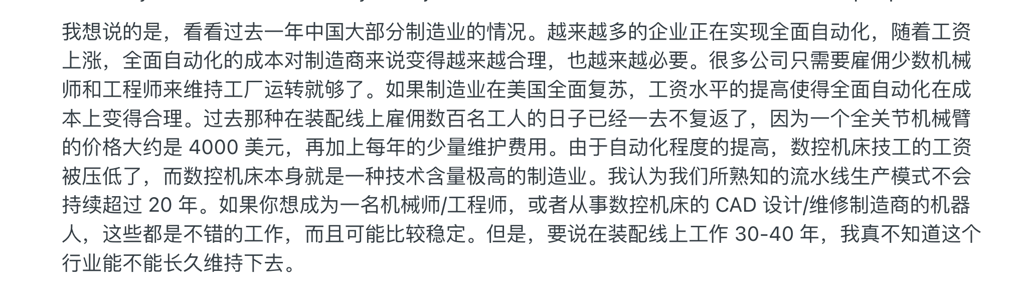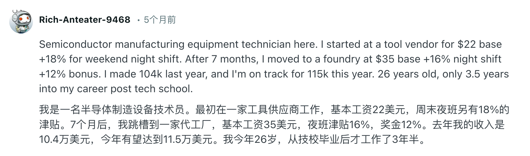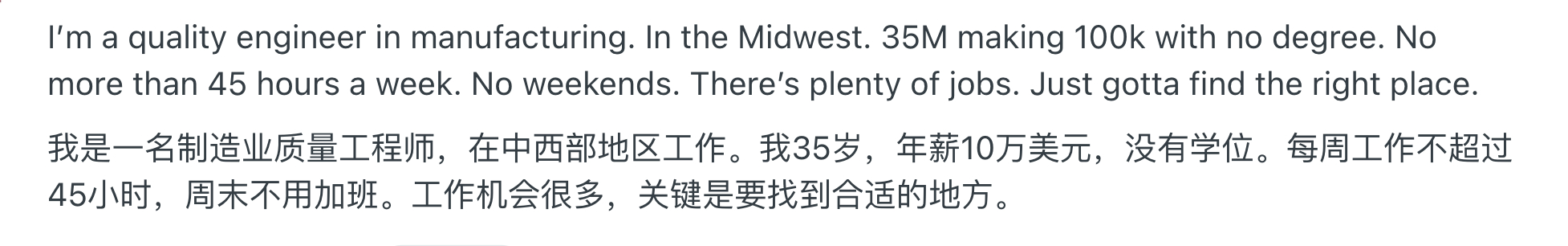 所以讨论到最后,有人总结得很直白:在美国,制造业不是轻松的工作,但对愿意学技术的人来说,依然是一条能把收入做到 7–10万美元的现实路径。