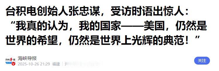 台积电创始人张忠谋,受访时语出惊人!他表示,他的国家——美国,仍然是世界的希望,仍然是世界上光辉的典范! 作为一手缔造台积电的传奇人物,被称为“半导体教父”的他,在采访中说的一番话,简直刷新了大家的认知,甚至让人觉得寒心。 很多人都知道张忠谋的厉害,正是他一手把台积电带到了全球半导体行业的顶端,让中国台湾地区的芯片产业站稳了脚跟,可很少有人知道,这位出身中国浙江宁波的企业家,早已把自己的根忘得一干二净。 张忠谋自己坚定认为,他的国家——美国,依旧是世界的希望,依旧是全球最光辉的典范,这话一出口,瞬间引发轩然大波。 不光如此,他还反复强调自己的身份,自从1949年来到美国、加入美国国籍之后,自己就一直是美国人,除此之外,没有任何其他身份,这番话,相当于直接和中国彻底划清了界限。 要知道,张忠谋出生在浙江宁波一个富裕家庭,童年时期辗转南京、上海、重庆、香港等多个地方生活,身上流着中国人的血,可他却甘愿背弃故土,一门心思把美国当成自己的祖国,实在让人难以理解。 年轻时的张忠谋十分优秀,凭借自己的努在美国哈佛大学读书一年,之后后转入麻省理工学院,毕业后,他没有选择回到祖国,而是留在了美国工作,一步步踏入半导体行业,慢慢闯出了名气。 27岁那年,张忠谋加入了美国德州仪器公司,凭借敏锐的商业嗅觉和过人的能力,他一路做到了公司副总裁的位置,还带领德州仪器发展成拥有6万名员工的大型企业,在行业内站稳了脚跟。 后来他没能成为德州仪器的接班人,再加上和公司的经营理念不合,1987年,张忠谋辞去了美国的工作,回到中国台湾地区创办了台积电,那时的台积电,还只是一个不被外界看好的小工厂。 没人想到,张忠谋凭借着在半导体行业多年的积累,硬生生把台积电做到了全球顶尖水平,成为全球芯片代工领域的龙头企业,甚至一度垄断了高端芯片代工市场,他也因此被称为“半导体教父”。 按说,台积电能有今天的成就,离不开中国市场的支持,离不开中国台湾地区的滋养,可张忠谋却丝毫没有感恩之心,反而在采访中极力讨好美国,刻意强调自己的美国身份,彻底背弃了自己的根。 有人说,张忠谋之所以这么做,都是为了利益,毕竟台积电的发展,离不开美国的技术和市场支持,他刻意讨好美国、强调自己的美国身份,就是为了让台积电能获得更多便利,保住自己的商业帝国。 可就算是为了利益,也不该背弃自己的祖国,不该忘记自己的根,一个人无论取得多大的成就,无论身处何方,都不该忘记自己从哪里来,不该忘记自己身上流淌的血脉,这是最基本的底线。 张忠谋的做法,也让很多人想起了他之前的言论,2023年那次采访中,他不光强调自己是美国人,还口出狂言,说美国芯片出口管制对大陆芯片产业造成影响,要是想扼杀中国大陆的芯片产业,根本无能为力。 他这番话,无疑是在讨好美国,毕竟当时美国正在全力打压中国半导体产业,张忠谋选择站在美国这边,甚至不惜抹黑自己的祖国,只为换取美国对台积电的支持,这份自私和冷漠,实在让人不齿。 可他终究打错了算盘,美国从来没有真正把台积电当成自己人,2025年就有媒体报道,美国以优厚条件引诱台积电在美国建厂,实则是想“掏空”台积电的技术和人才,实现“去台化”,把台积电彻底掌控在自己手中。 如今的台积电,在美国建厂屡屡受挫,生产成本大幅增加,发展陷入困境,早已没有了当年的风光,而张忠谋,一边坚守着自己的“美国梦”,一边看着自己一手缔造的商业帝国陷入困境,不知是否会有一丝后悔。 其实,一个人的身份从来不是靠国籍定义的,而是靠初心和底线,无论加入哪个国家的国籍,都不该背弃自己的故土,不该抹黑自己的祖国,爱国从来不是一句口号,而是刻在骨子里的坚守和担当。 我们从不否认张忠谋在半导体行业的成就,可也绝不会认同他背弃祖国、讨好美国的做法,一个忘记根的人,就算取得再大的成就,也终究会被人唾弃,终究会为自己的自私和冷漠付出代价。 爱国不分高低,不分远近,无论身处何方,无论从事什么行业,都该铭记自己的故土,坚守自己的初心,这才是一个人最该有的底线,也是一个人最珍贵的品质,愿我们都能铭记初心,坚守底线,心怀家国,不负韶华。 大家对此有什么看法呢?欢迎各位在评论区留言!