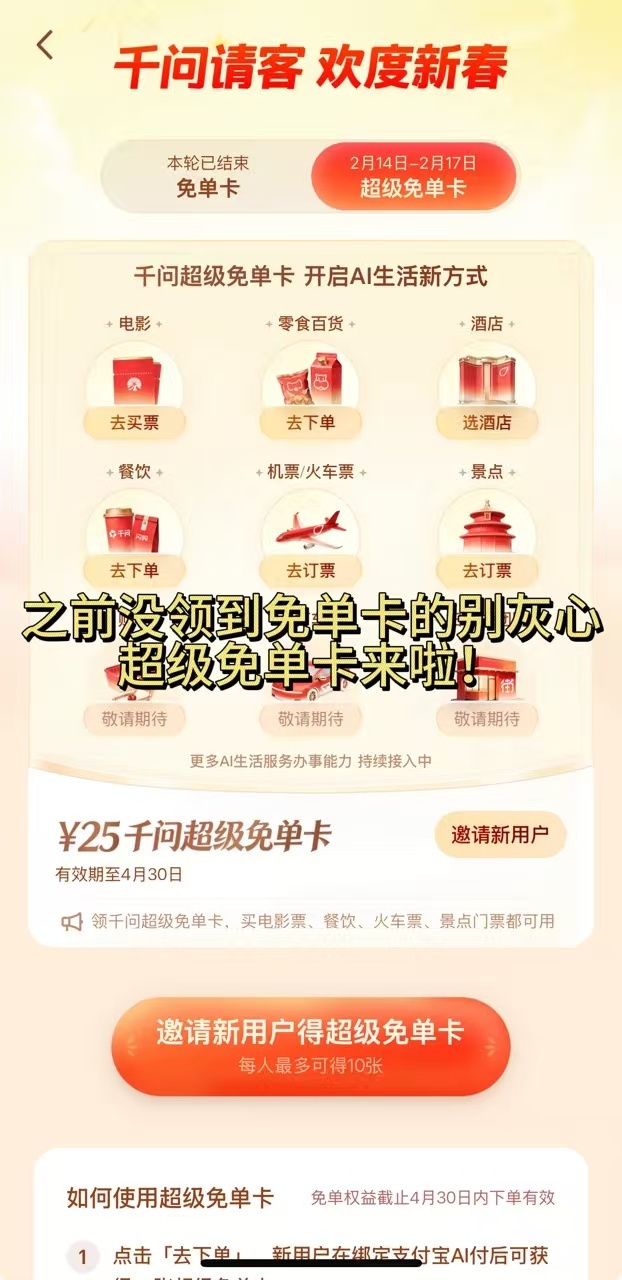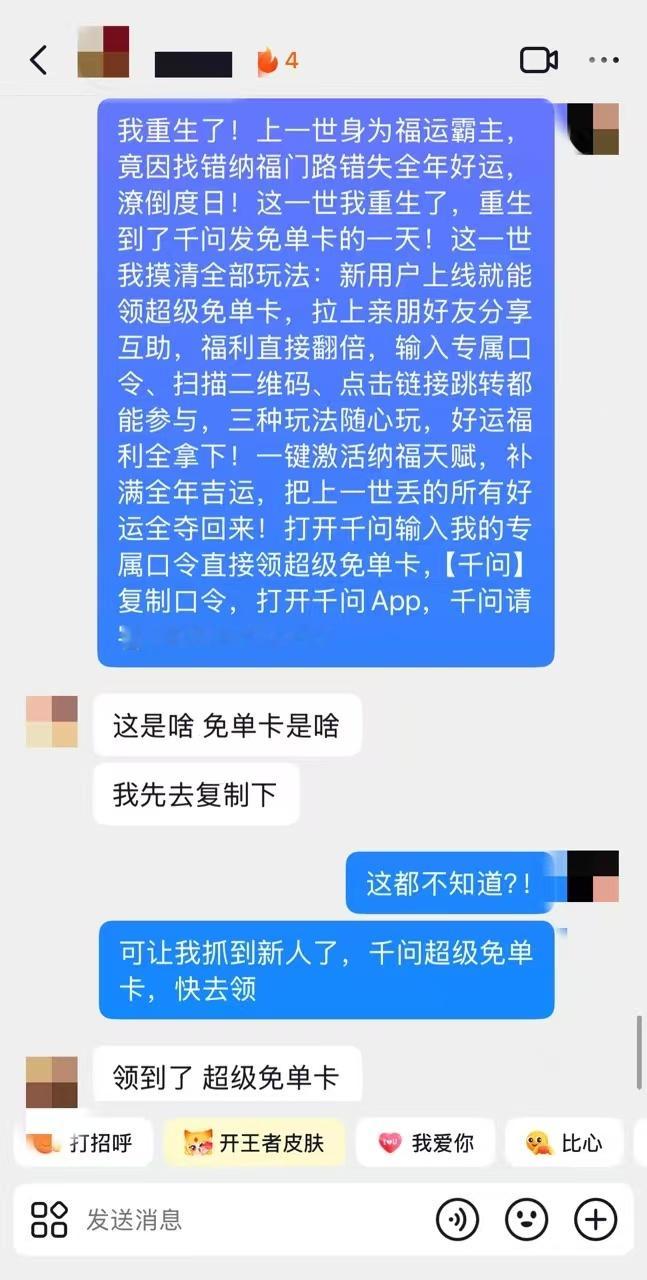 千问再次激活群聊 尽管微信封了千问的链接和口令,但还是挡不住大家的热情,很久没有活跃的群,又在发千问邀请了,还有各种帖子下面不少人也是发自己的码。互联网春节红包玩法这么多年都腻了,这种现象好久没有了,我承认我之前对千问的声音是大了点,还得是千问不玩套路真金白银的砸有效果,其它家也是雷声大雨点小,都没看到人玩了,你们开出超级免单卡了吗?