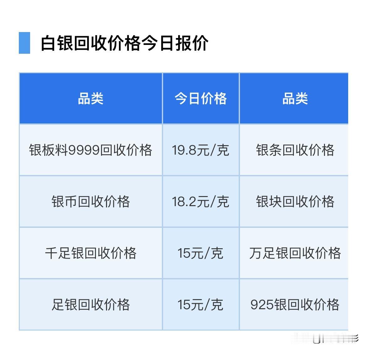 今日银价查询!(2026.2.15)各品种白银回收报价查看!以及银价走势分析! 随着黄金价格的上涨,银价也跟随上涨,对于想购买白银的人来说,了解今日银价是很重要的。 那么先来看看,现在白银回收各品种报价是多少钱一克了? 银板料9999回收价格19.8元/克,银条回收价格18.2元/克,银币回收价格18.2元/克,银块回收价格18.2元/克,千足银回收价格15元/克,万足银回收价格15元/克,足银回收价格15元/克,925银回收价格13元/克。 同昨天(2月14日)各品种白银回收报价相比较,今天各品种白银回收价格都整体下跌了0.2元/克。 今日白银价格19.2元/克,银饰零售价格每克21至42元区间。 在购买银饰或者制品时,价格会因为设计、工艺和品牌等因素有所不同,另外银价也是每天变化的。 根据黄金价格网消息:国际现货白银(伦敦银现)最新报价77.146美元/盎司,较前一交易日上涨2.01美元,涨幅2.68%,日内最高触及79.325美元/盎司,最低74.685美元/盎司; 纽约COMEX白银期货同步走强,报77.27美元/盎司,上涨1.588美元,涨幅2.10%,国际银价受美元指数回落、市场避险情绪升温支撑小幅反弹,整体运行平稳。 国内贵金属市场因春节假期休市,价格保持节前收盘水平。上海黄金交易所白银T+D收盘19270元/千克,下跌649元,跌幅3.26%,节前开盘19722元/千克,盘中最高19850元/千克,最低18005元/千克; 沪银主力合约收盘19782元/千克,下跌1155元,跌幅5.52%,国内市场节前因资金离场、获利回吐出现回调,内外盘走势出现短暂分化。 行情核心驱动: 美联储3月降息预期,提升贵金属避险与抗通胀属性。 叠加光伏、新能源汽车等工业需求稳步增长,全球白银供需缺口持续扩大。 有关机构提示,当前银价涨幅较快,短期或有技术性回调,投资者需警惕高位波动风险,合理控制仓位。 再来分享个白银回收怕踩坑,记住这3点,肯定能守住你的钱袋子。 第一:要了解当天的大盘银价,因为回收价是在大盘银价基础上减掉几毛钱。 第二:回收不看品牌样式,更不会看付款记录和小票,只看纯度和克重。所以千万不要被无良商家压低价格。 第三:回收前最好自己先称重量,反复多称几次,避免和商家扯皮。误差在1g和0点几克属于正常情况,但如果误差太多,那你可要小心了。 以上价格反映了当前白银回收市场的最新行情。 具体回收价格跟白银纯度、白银克重、白银行情以及回收商等因素有关。 请投资者和回收商密切关注市场动态,以便做出合理的交易决策。 所有信息,都只是提供参考价值! 投资有风险,理财需谨慎! 黄金白银价格 白银市场行情 白银价格 白银价格行情 白银一克 白银金价 银价