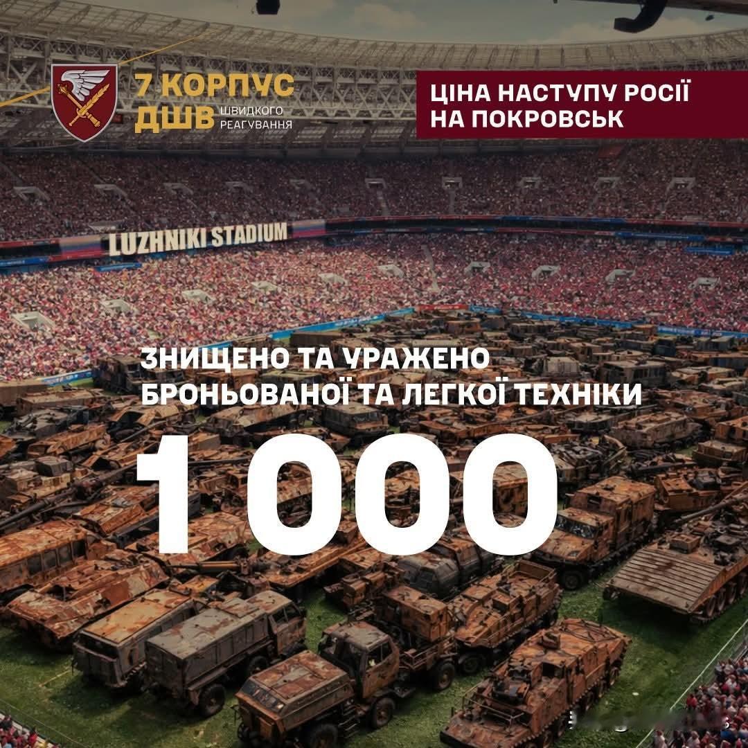 🛡️《乌克兰第7空降突击军报告》—俄军在波克罗夫斯克地区损失惨重 俄军的尸体足以填满整个红场:敌军在波克罗夫斯克地区半年来的惨重损失 波克罗夫斯克地区经历了长达半年的激烈战斗。 秋季,俄军在此集结了规模空前的兵力,企图发动「闪电战」。 然而,他们遭到了乌克兰(DSHV)第7快速反应军防线的顽强抵抗。 俄军为所谓的「闪电战」付出了惨痛的代价。 我们决定用简洁易懂的影像来展现敌军过去半年来的惨重损失: ❌约15,000名俄罗斯士兵被击毙或击伤 我们计算过:如果把他们的尸体装进黑色塑料袋,紧密排列,这些袋子足以填满整个红场。 ❌约1000辆被摧毁和损坏的车辆-包括装甲车、汽车、全地形车和摩托车 这些废金属足以铺满俄罗斯最大的体育场之一——卢日尼基体育场的草坪,成为「我们如何四次攻占波克罗夫斯克」展览的展品。 ❌约150套受损的火砲系统及多管火箭炮 如果把所有这些装备排成一列,长度可达1.5公里。这相当于莫斯科最著名的「繁华」步行街之一——阿尔巴特街的长度。 ❌约23000架被击落部署的攻击无人机 这是一个难以想象且难以比拟的数字。 因此,我们只想展示同时使用这些无人机可能造成的爆炸景象。 多亏我军的英勇作战,才避免了这场爆炸。 俄乌战争